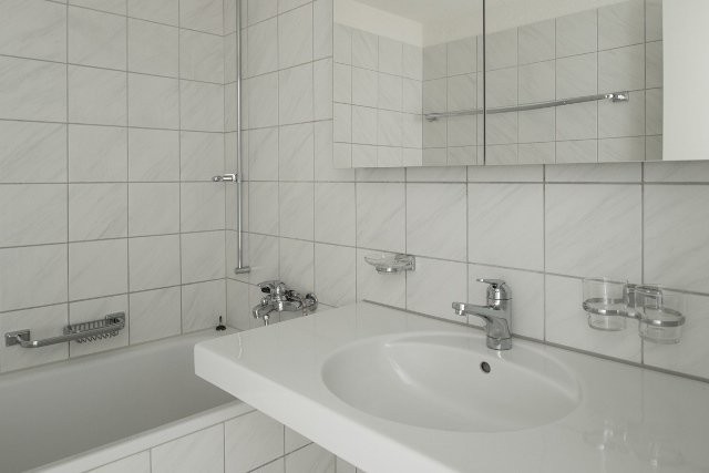- Badezimmer mit WC, Lavabo, Spiegelschrank und Badewanne