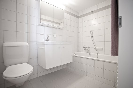 - Nasszellen mit Dusche und Badewanne, mit hellem Plattenboden versehen