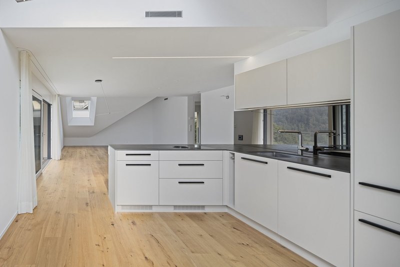 Der Zugang erfolgt direkt über den Lift, der Sie komfortabel in beide Etagen bringt. Das grosszügige Wohn- und Esszimmer begeistert mit Helligkeit, prächtigen Dachfenstern und einem atemberaubenden Blick. Die offene Küche mit Reduit ist modern ausgestattet und lädt zum Kochen und Geniessen ein. Zwei Schlafzimmer, ein grosses Bad mit Badewanne und Dusche, ein separates Gäste-WC sowie ein äusserst grosszügiges Entrée mit viel Stauraum runden das Raumangebot auf dieser Etage ab.