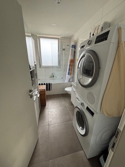 - Badezimmer mit WC, Lavabo, Spiegelschrank, Badewanne und eigenem Waschturm (Waschmaschine und Trockner)