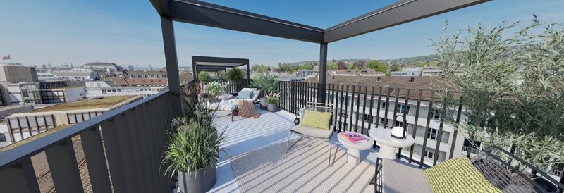 Grosszügige Aussenbereiche : Jede Wohnung verfügt über eine grosszügige Dachterrasse mit viel Privatsphäre und atemberaubenden Sonnenuntergängen - ideal für After-Work Drinks, Dinner mit Friends oder entspanntes Weekend-Lounging an bester Lage in Zürich.