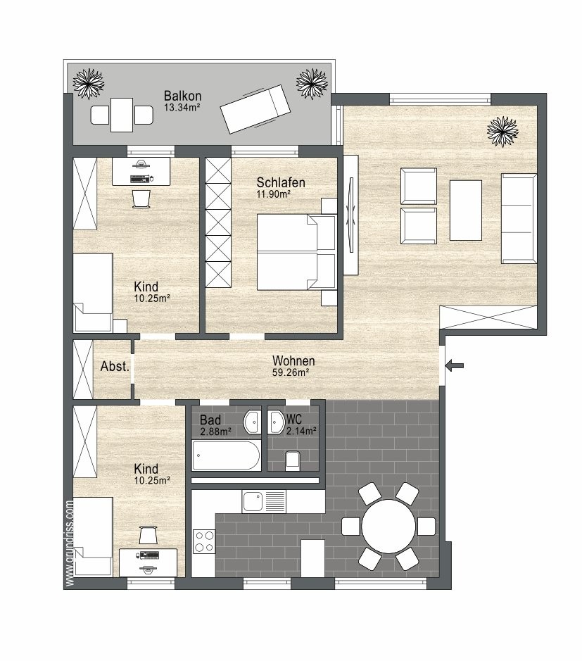 Die ca. 100 m2 grosse Wohnung verfügt über: