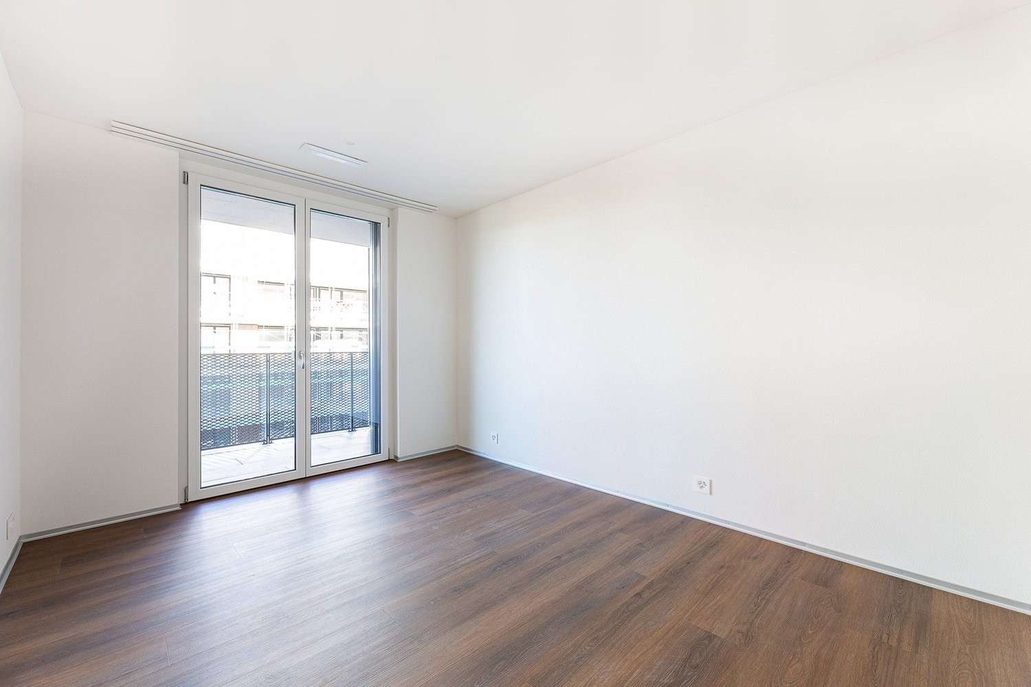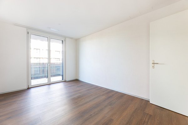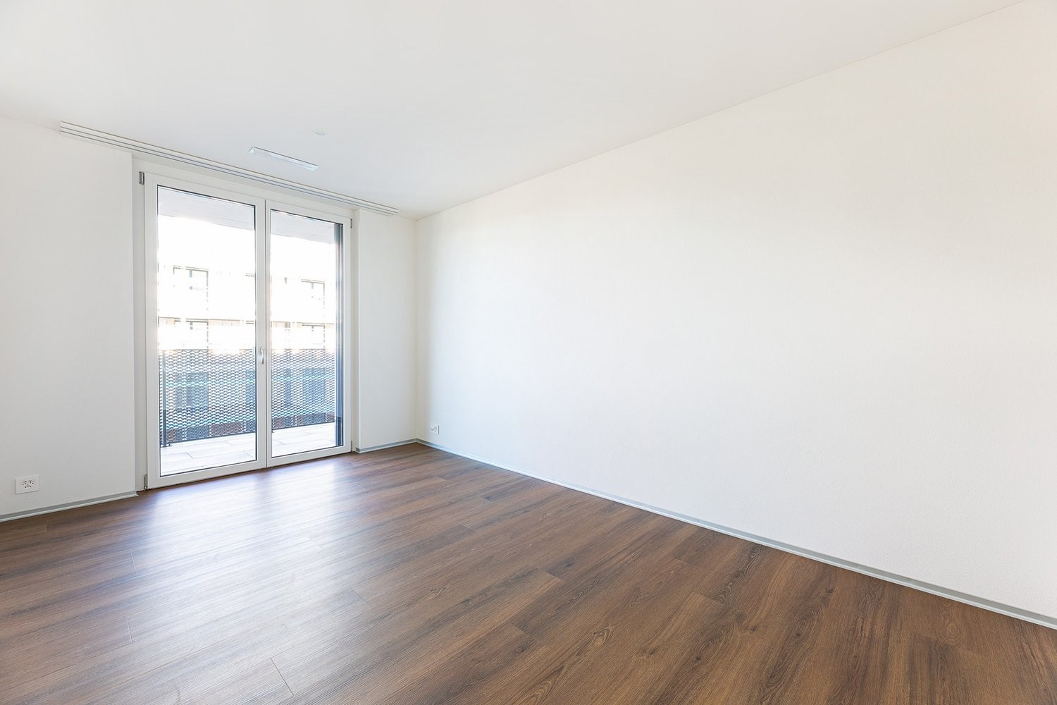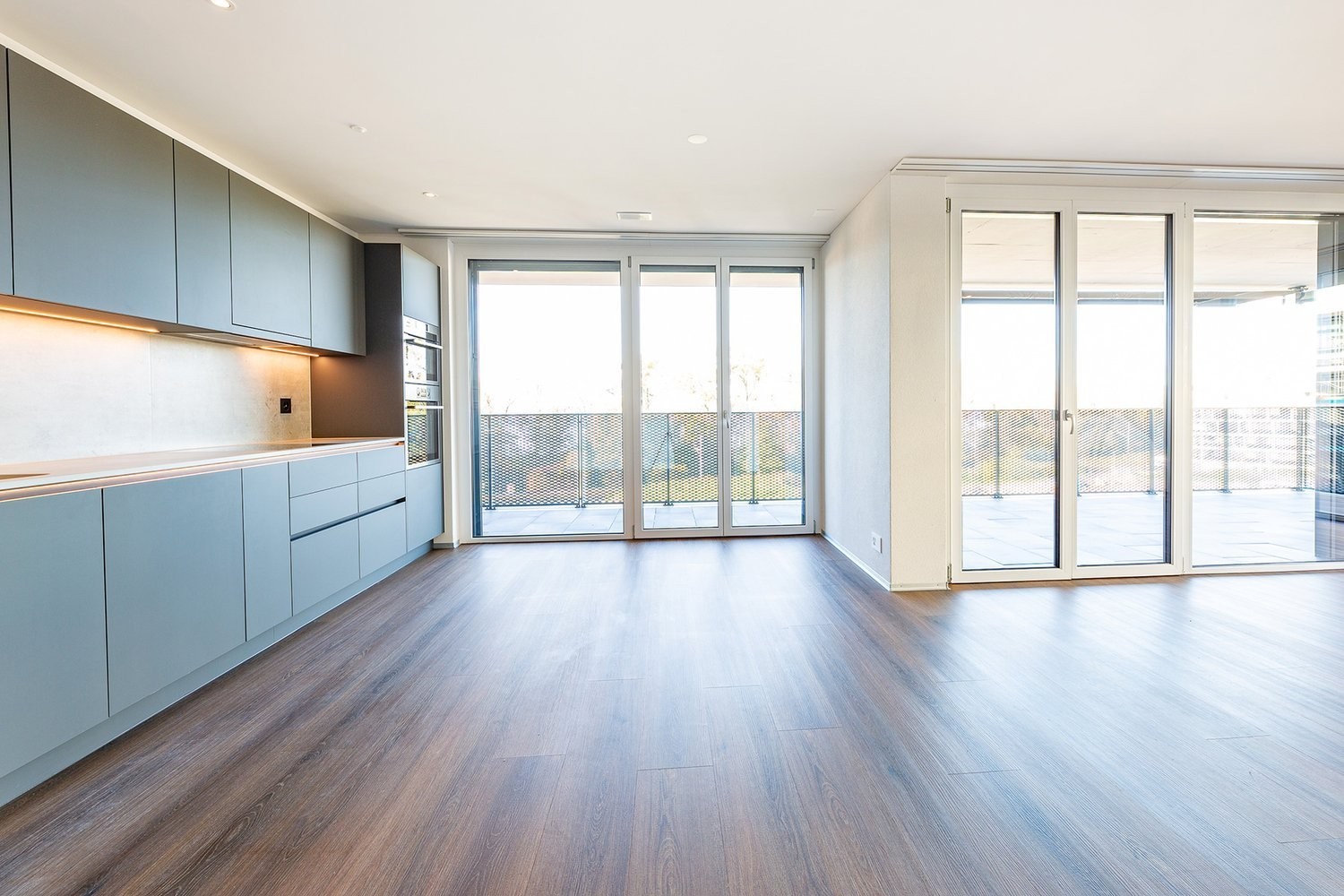 Grosszügige Wohnräume: Helle Zimmer mit edlen Holzböden, weissen Wänden und bodentiefen Fenstern mit Schiebetüren zum Balkon