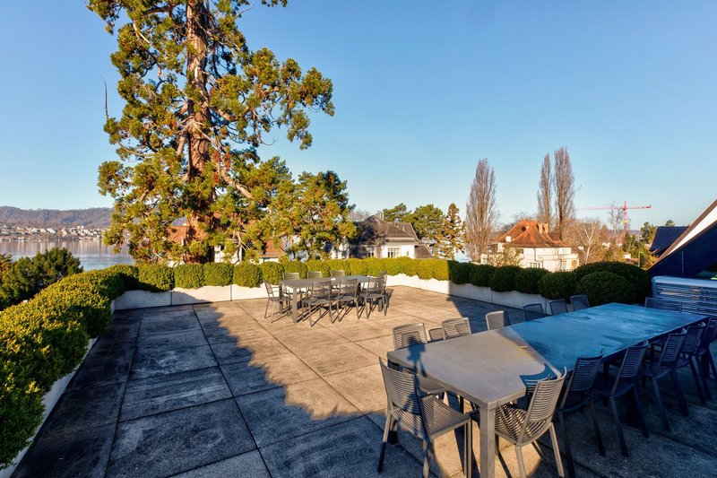 Die markante Architektur mit ihrer verspielten Glasfassade und der üppigen Begrünung verleiht dem Gebäude einen einzigartigen, repräsentativen Charakter. Die grosszügig konzipierten Büroräumlichkeiten sind vollständig ausgebaut und klimatisiert. Terrassen mit Seeblick, hochwertig ausgestattete Sitzungszimmer sowie eine hauseigene Bar für entspannte Anlässe runden das Angebot ab.