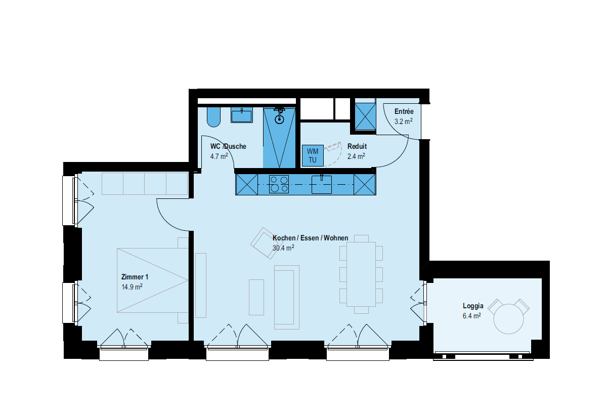 North-west facing loggia (6.4 m²)