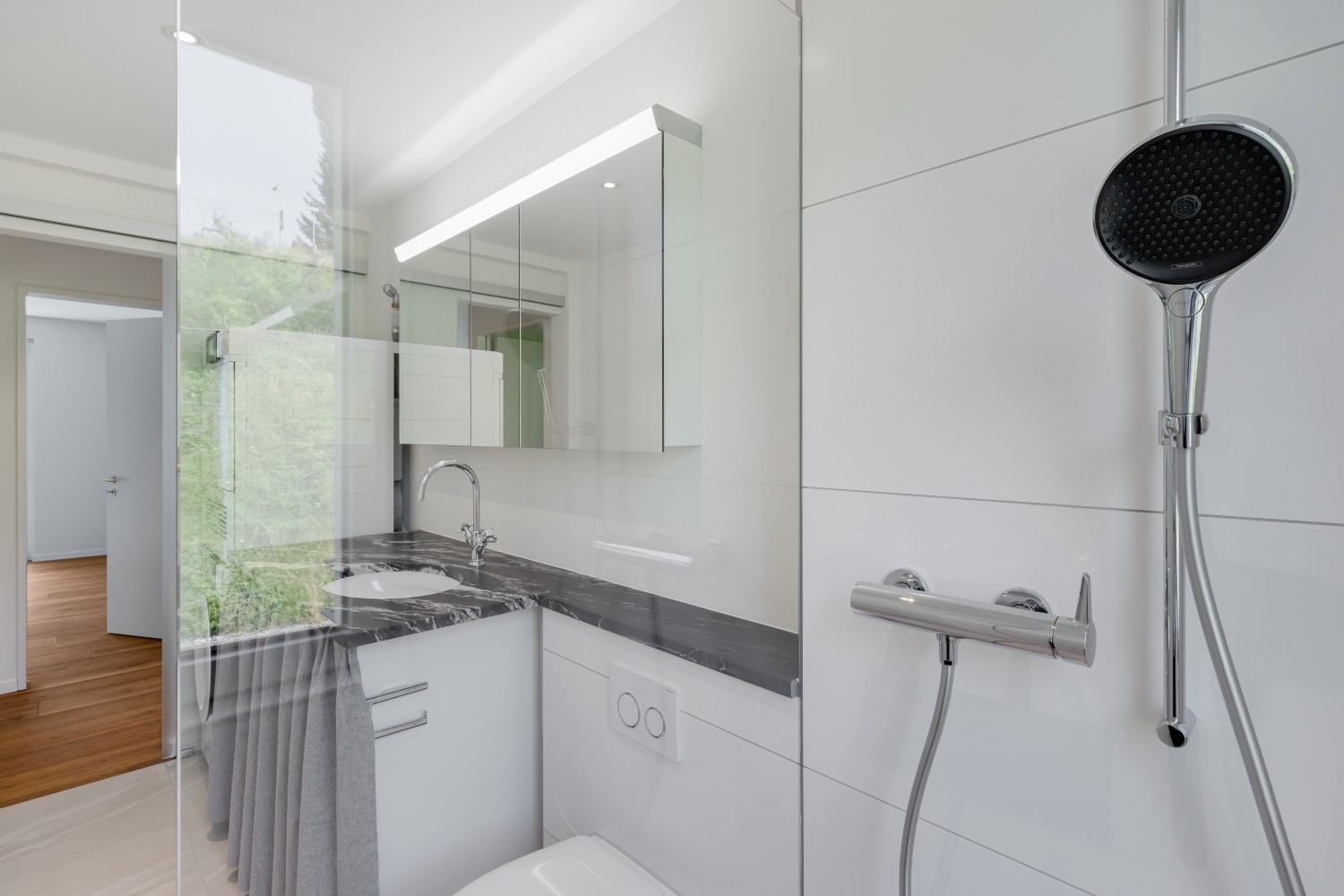 Edles Eichen-Dielenparkett im Wohnbereich sowie pflegeleichte Feinsteinzeugplatten in den Nasszellen