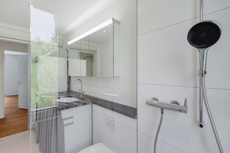 Elegantes Badezimmer mit Tageslicht und begehbarer Dusche