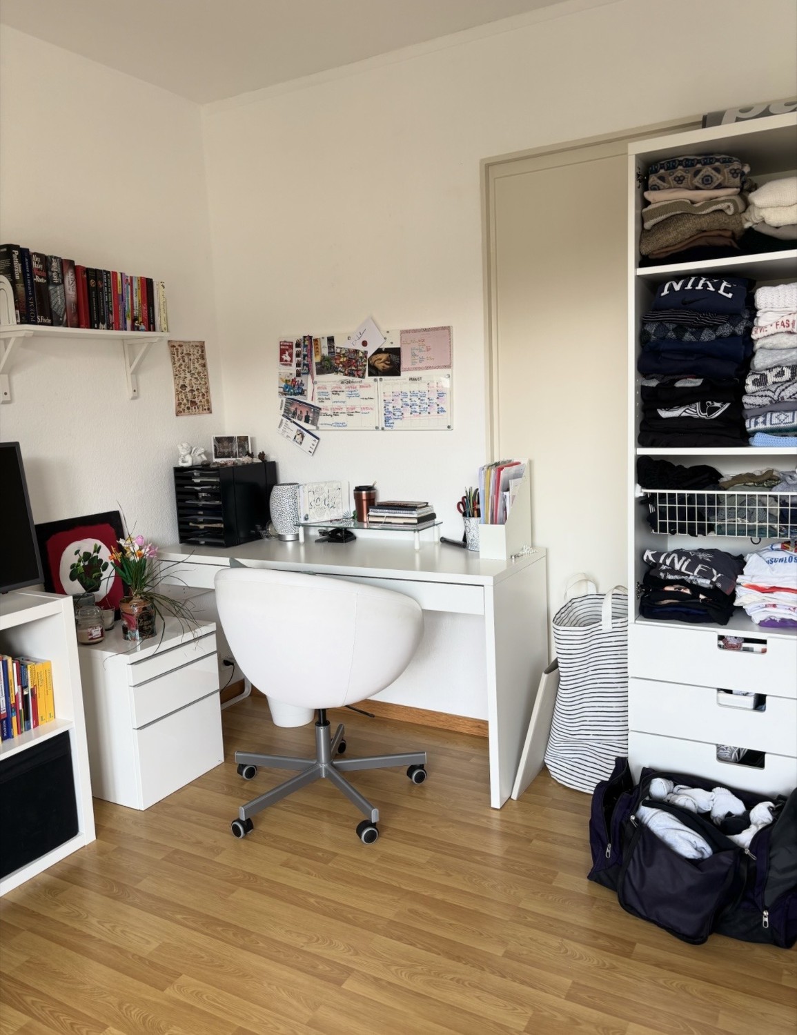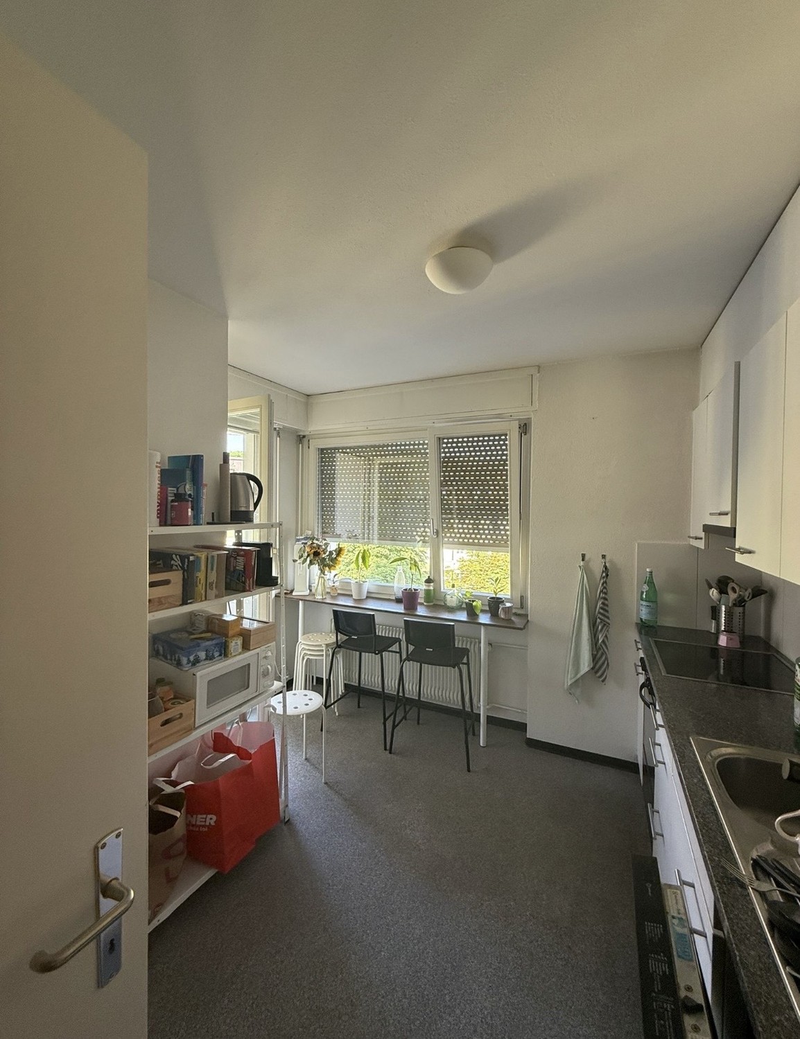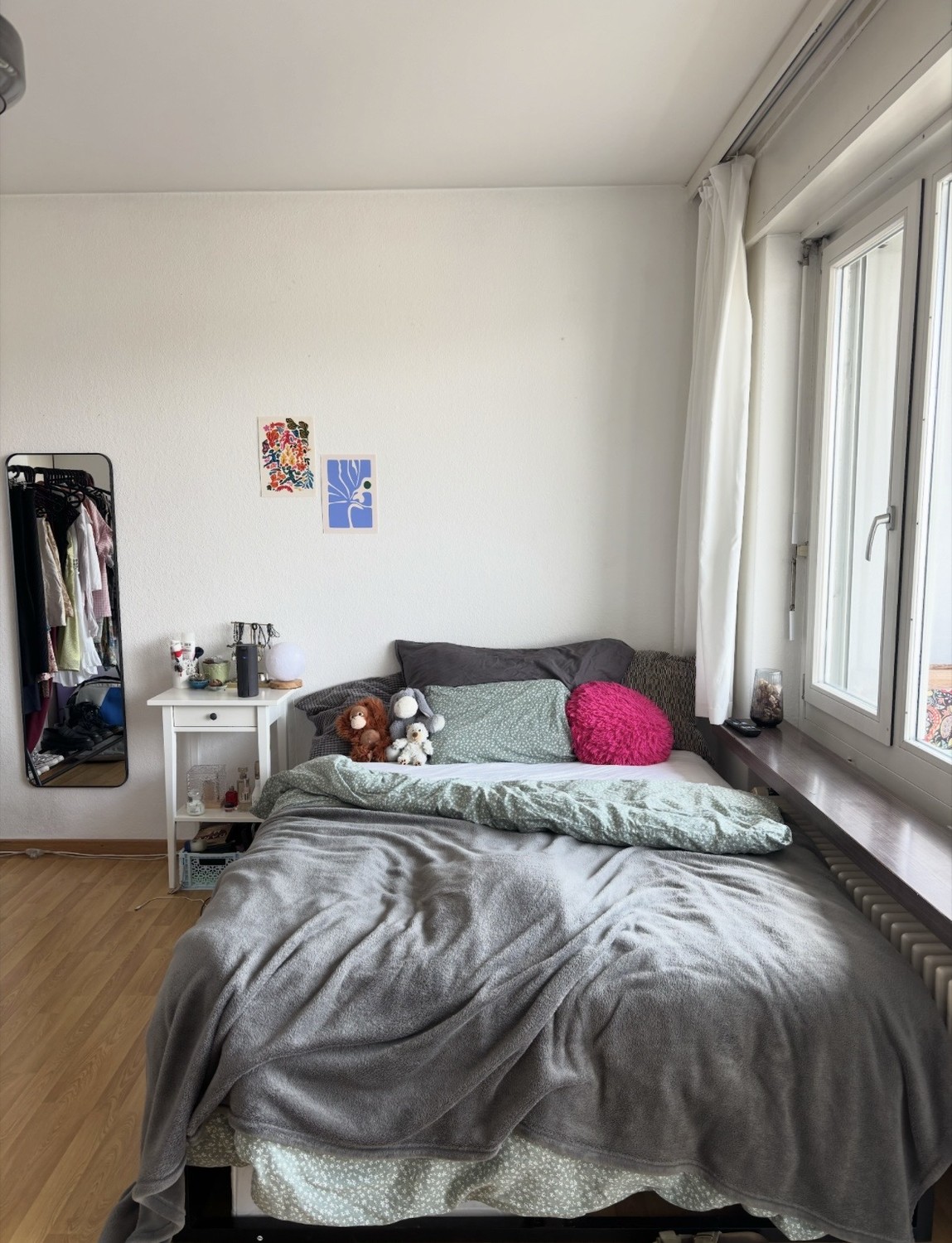 Das Zimmer ist ca. 16qm2 gross und durch das grosse Fenster sehr hell. Es ist Teil einer 5 Zimmerwohnung im 4. Stock (mit Lift), welche zusätzlich zu den vier Zimmern ein grosses Wohnzimmer sowie eine Küche, Badezimmer (zwei Lavabos und Badewanne) und ein zusätzliches separates WC hat. Zudem verfügt die Wohnung über ein Kellerabteil und zwei Balkone, wovon einer zur gemeinsamen Nutzung offensteht. Dort lässt es sich besonders schön in der Abendsonne gemeinsam Znacht essen.