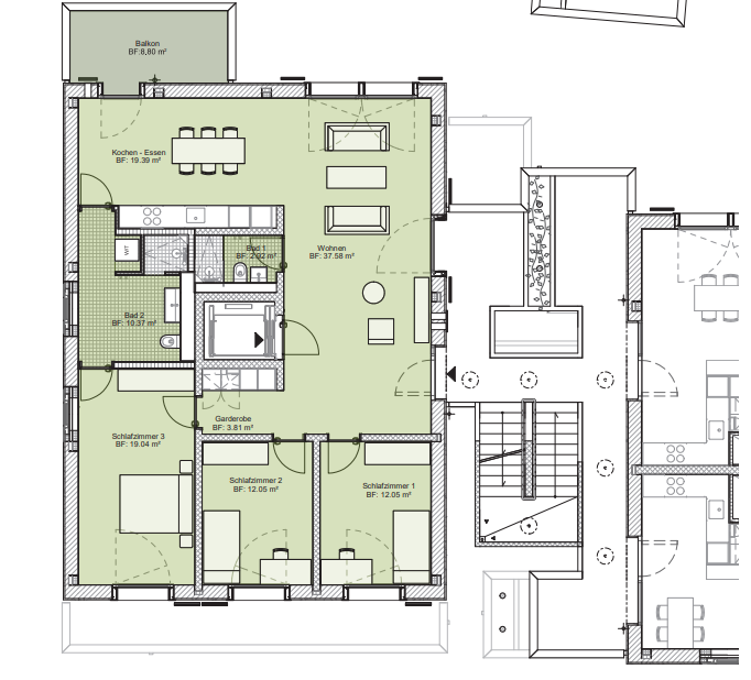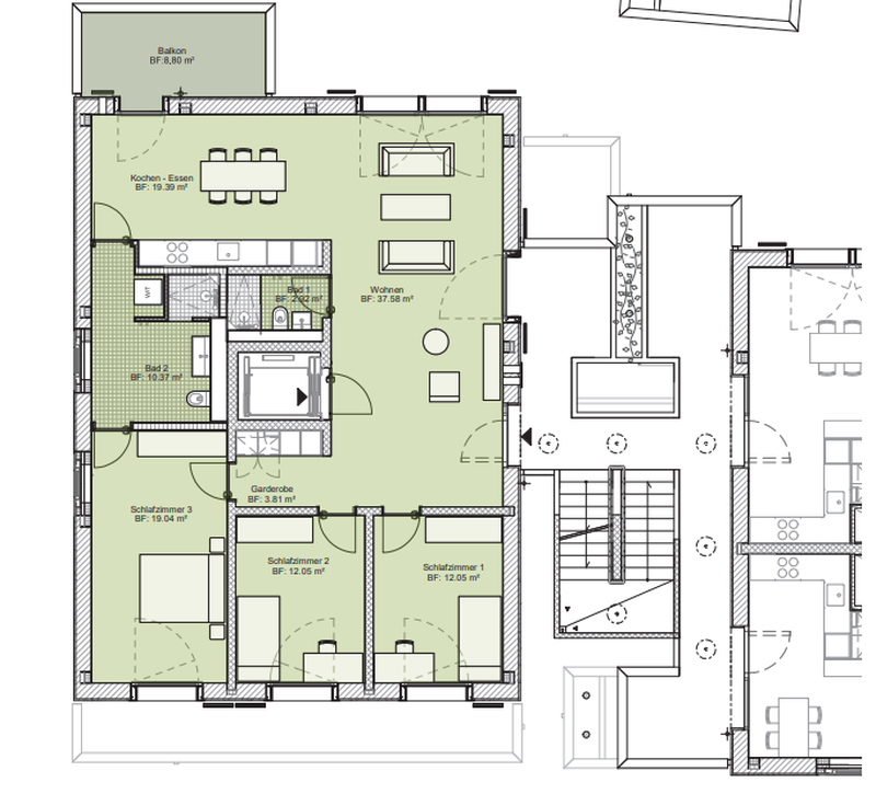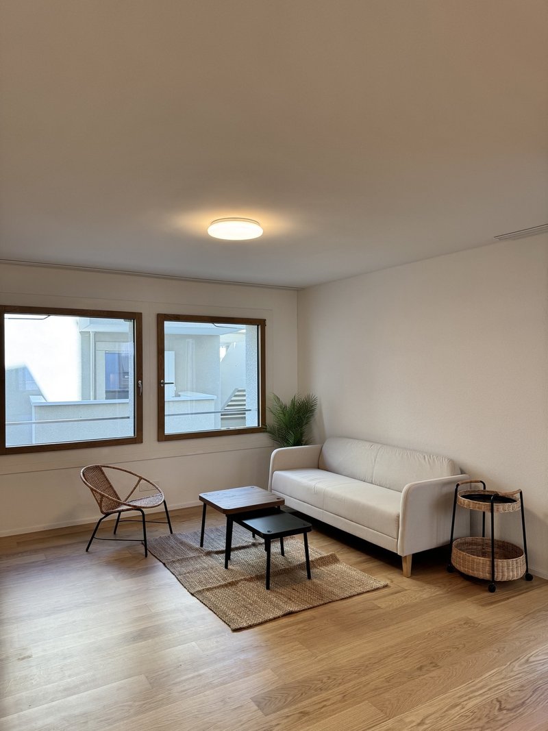 Gemeinschaftseinrichtungen: Ein gemütlicher Balkon sowie ein grosses Wohnzimmer mit offener Küche (60m2)