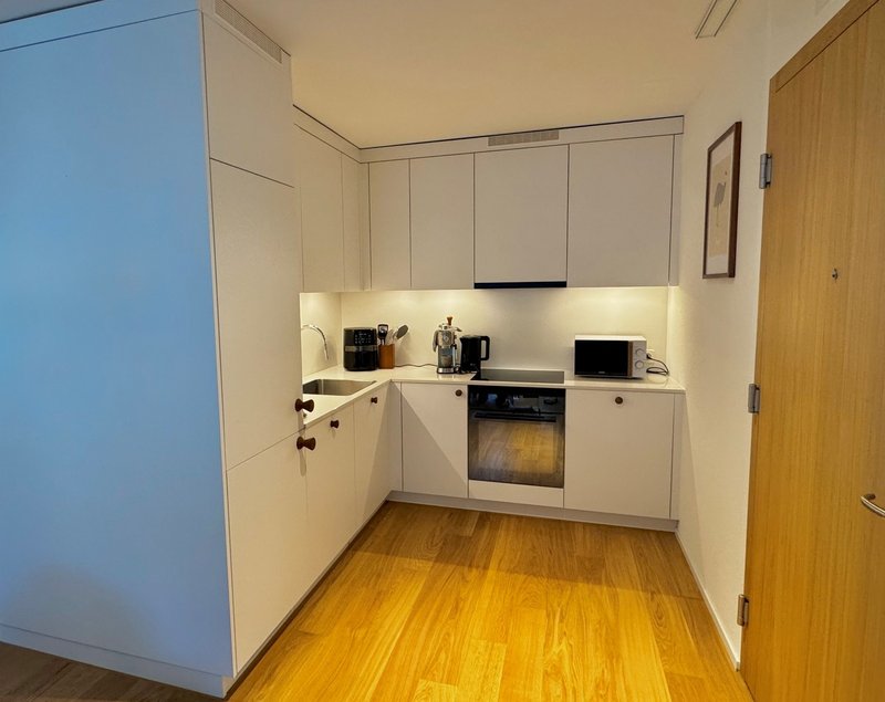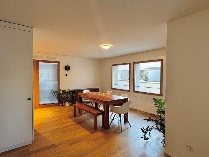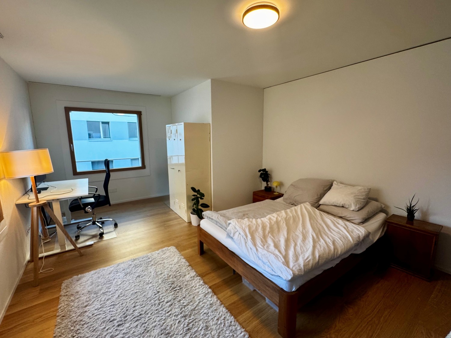 The apartment is part of a modern residential project, features large windows, and is ideal for a single person or a couple. Amenities include a private washer-dryer tower, induction stove, and a rain shower. In addition, a shared rooftop terrace in the neighboring building is available — perfect for apéros with views over Altstetten and towards the mountains.