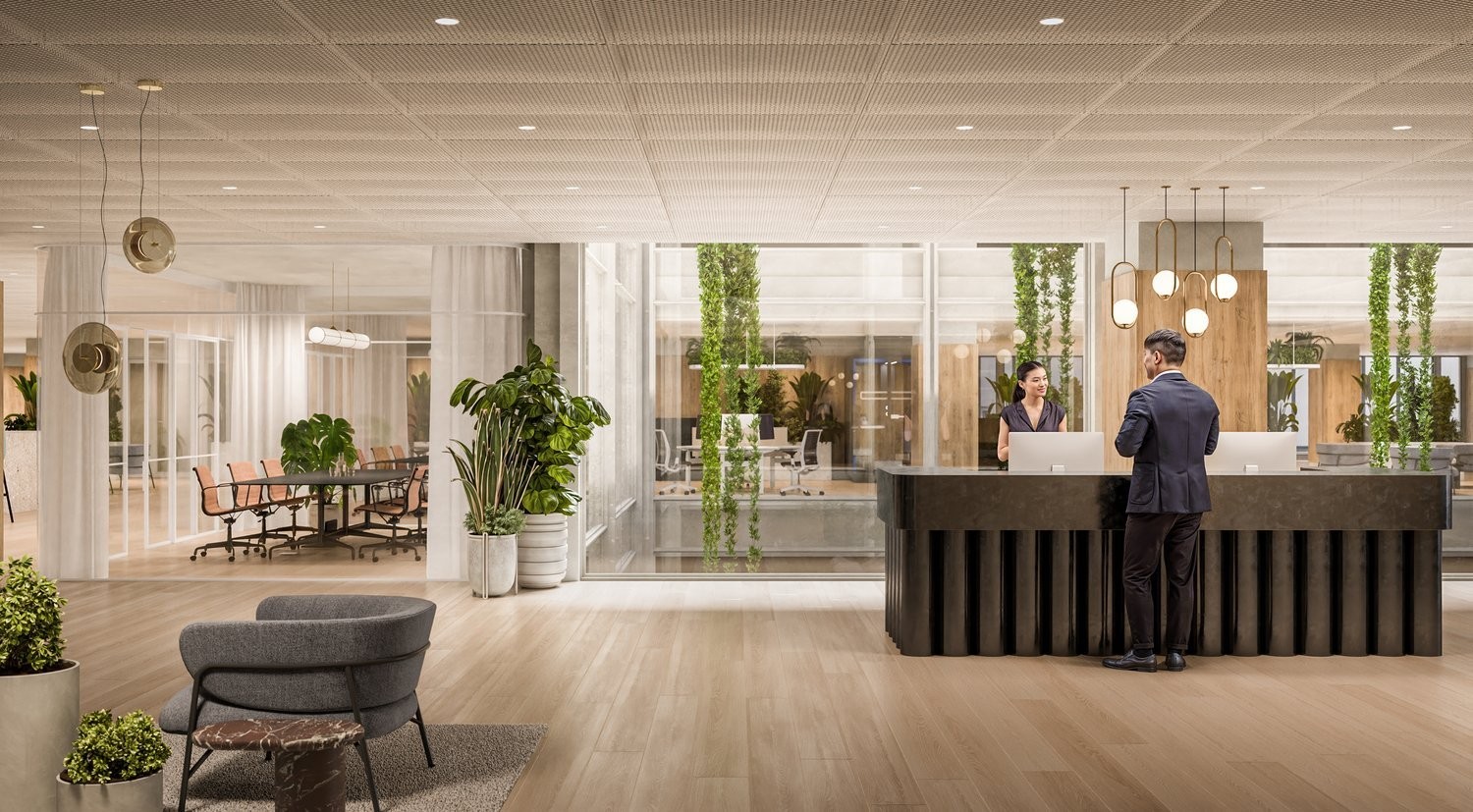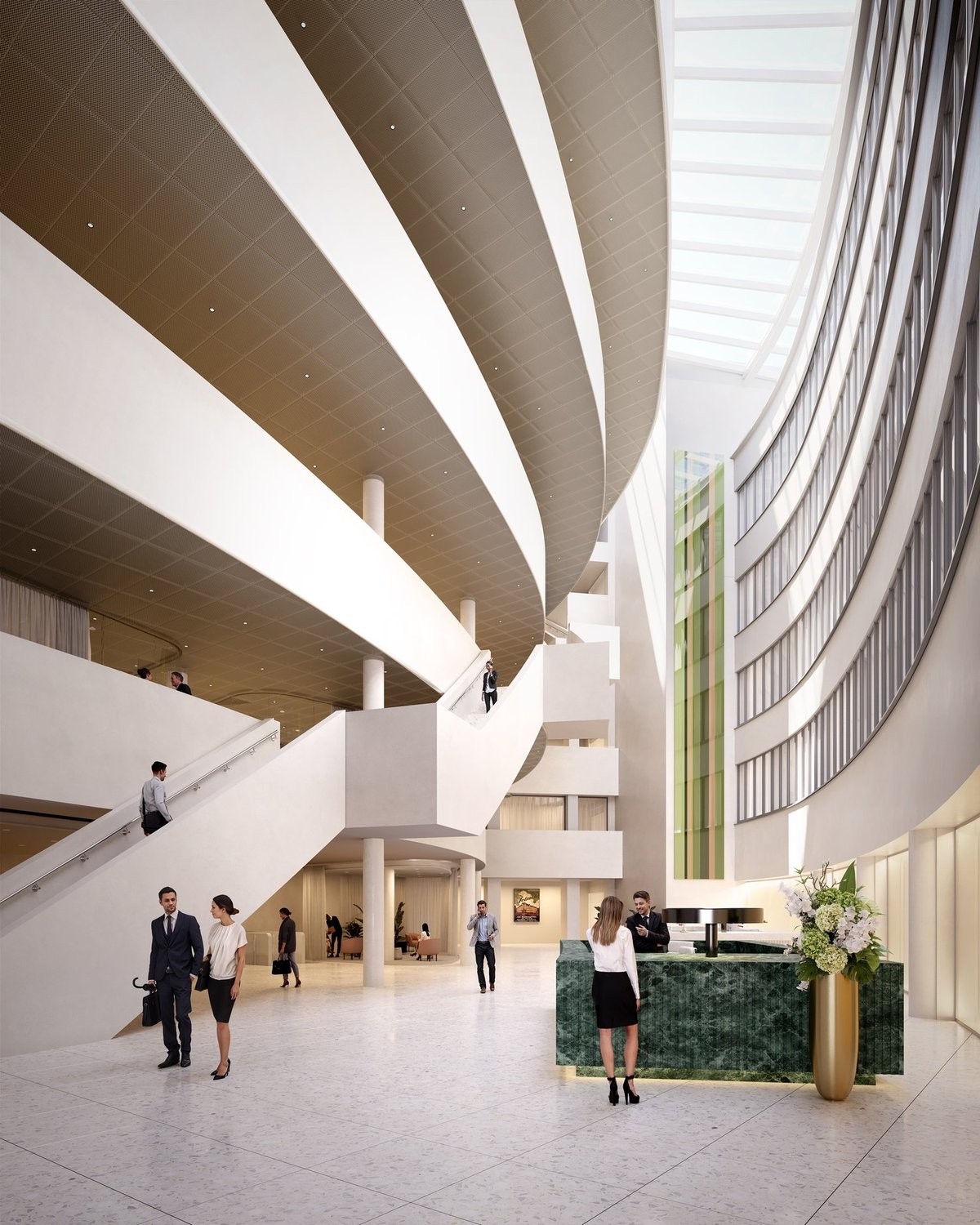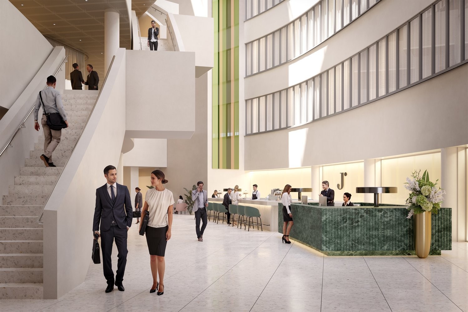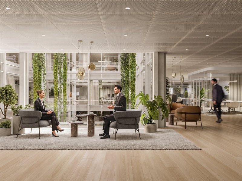 Die grosszügige Lobby, geprägt vom architektonischen Erbe von Tilla Theus, schafft eine einladende Atmosphäre mit Casual Meeting Spaces und lebendigen Treffpunkten. Mieter profitieren von exklusivem Zugang zum Businessclub sowie von attraktiven Corporate Rates.