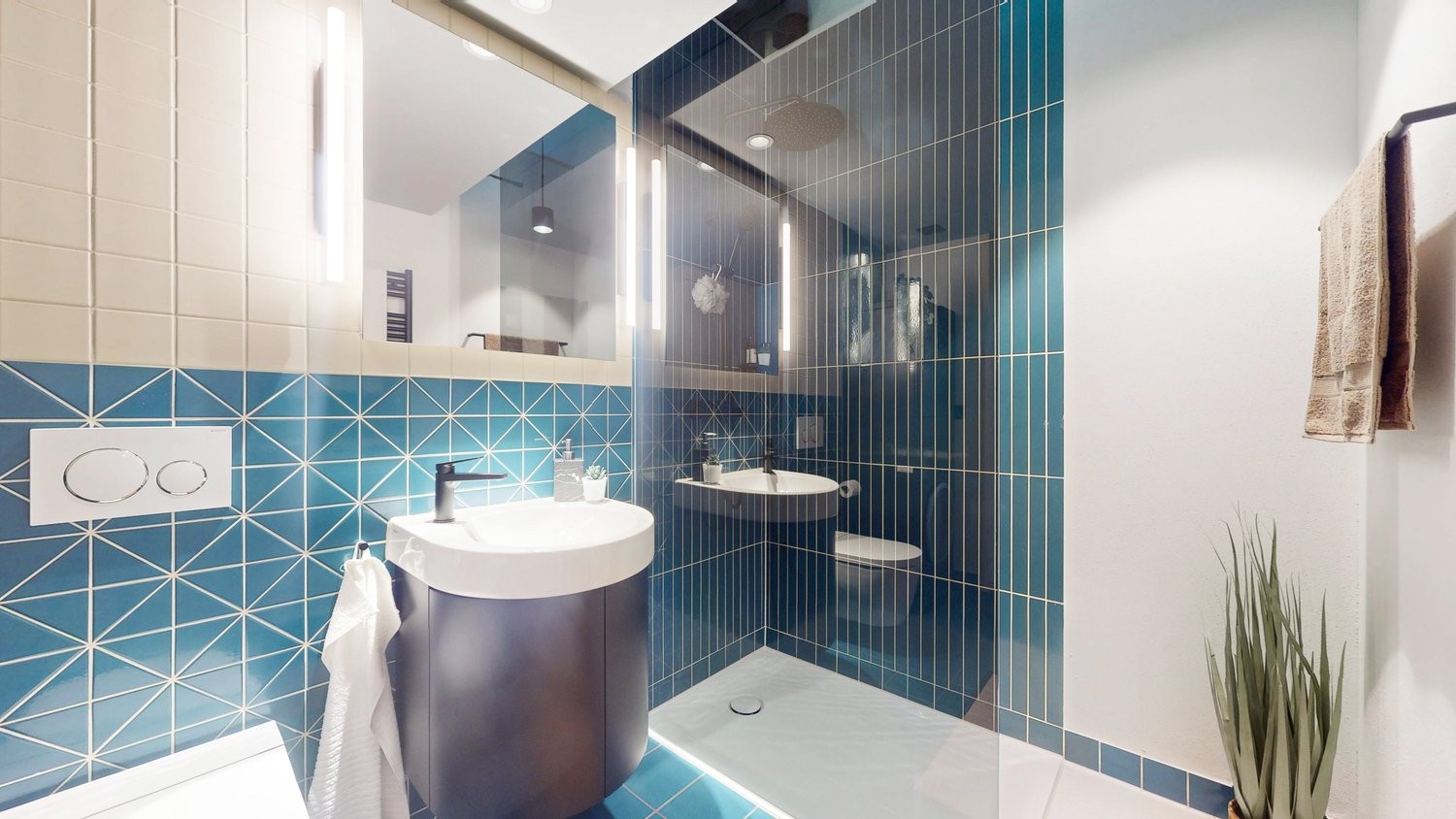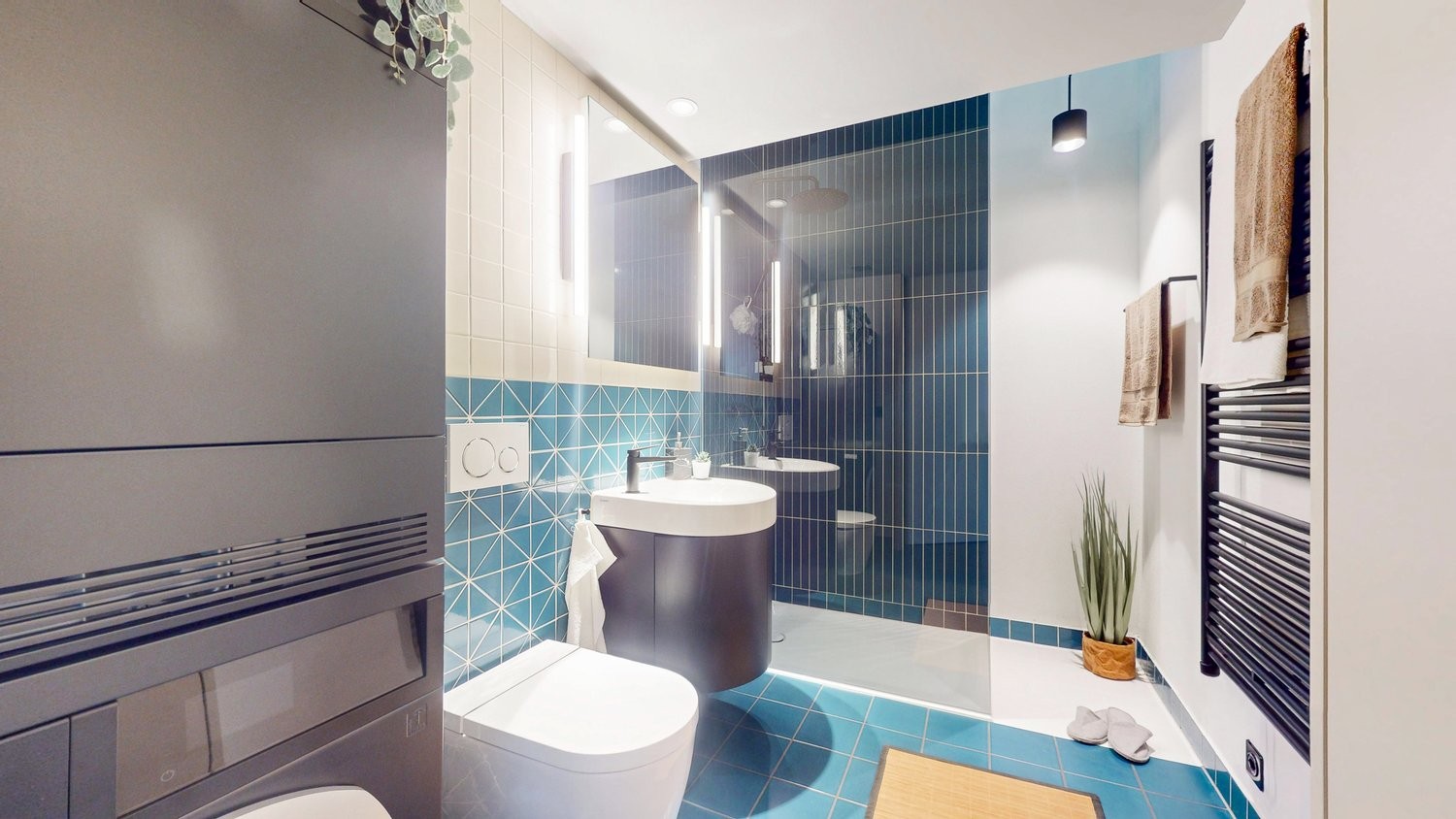 - Duschbad/WC/Lavabo Kubus innen mit Plattenboden türkis