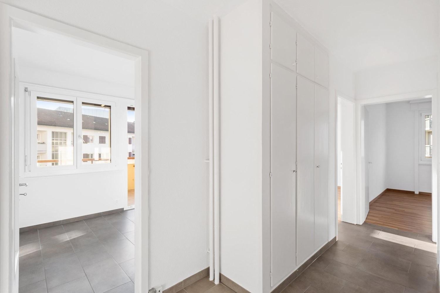 - hall avec armoires murales - cuisine agencée fermée - salle-de-bains avec WC - WC séparé - séjour avec parquet - deux chambres avec parquet - balcon