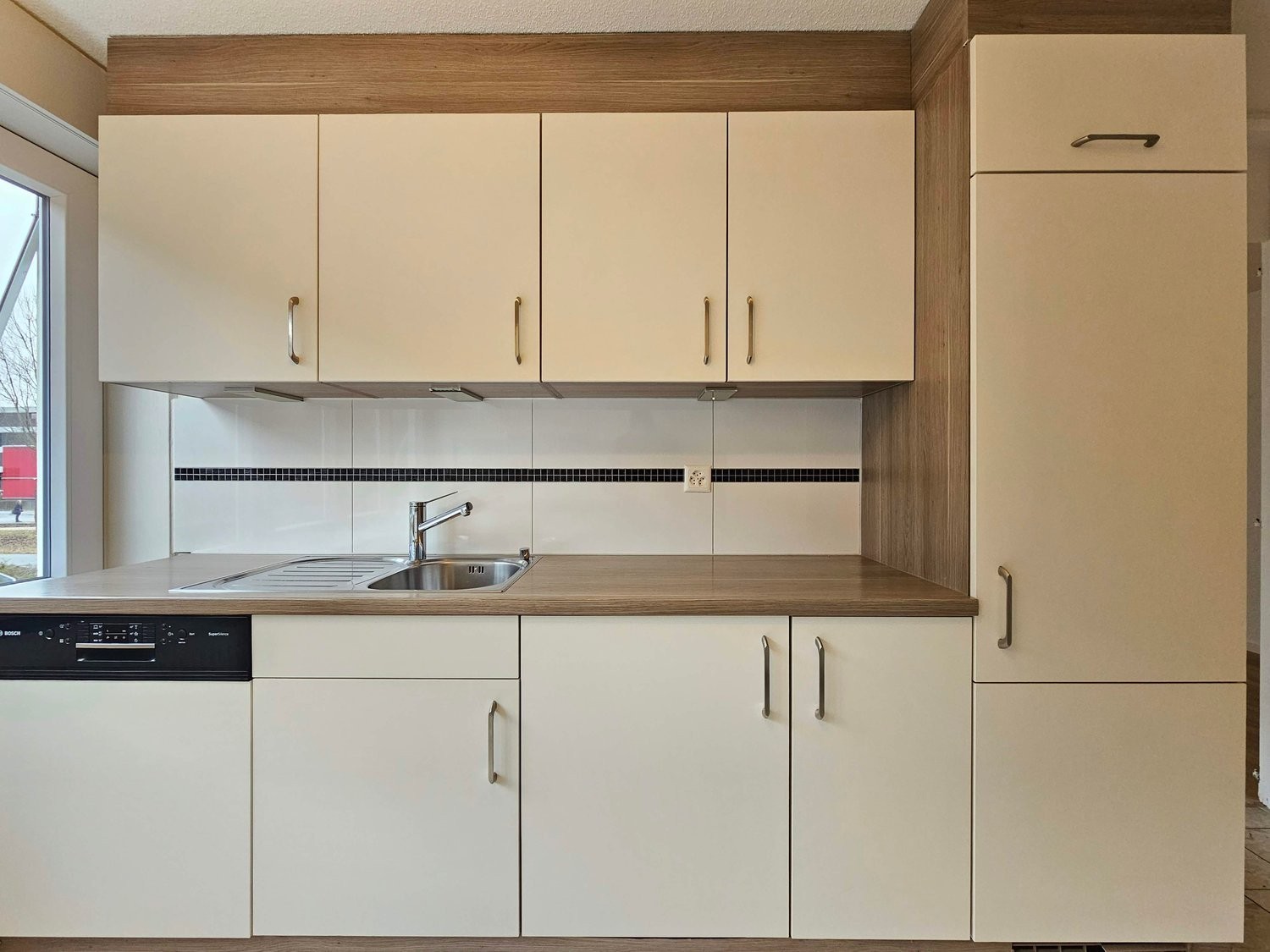 Moderne Küche: Weisse Küche mit hölzernen Arbeitsplatten, weissen Schränken, eingebautem Ofen und Geschirrspüler, weisser Fliesenrückwand sowie grossen Fenstern mit Jalousien und Unterschrankbeleuchtung