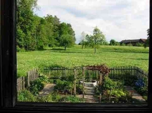 Eigener grosszügiger Garten-Bereich: umzäunter Bauerngarten mit Apfelbaum, Blumen, Kräutern, Beeren und Reben. Liegewiese angrenzend an grosse Wiese.