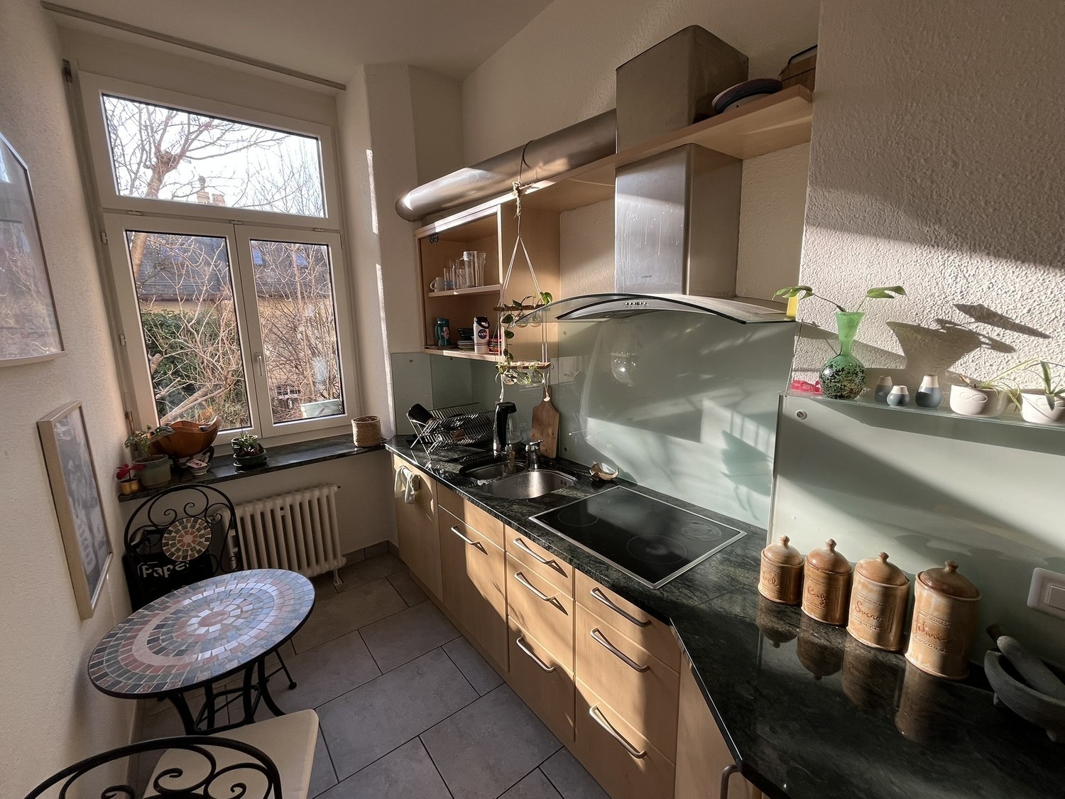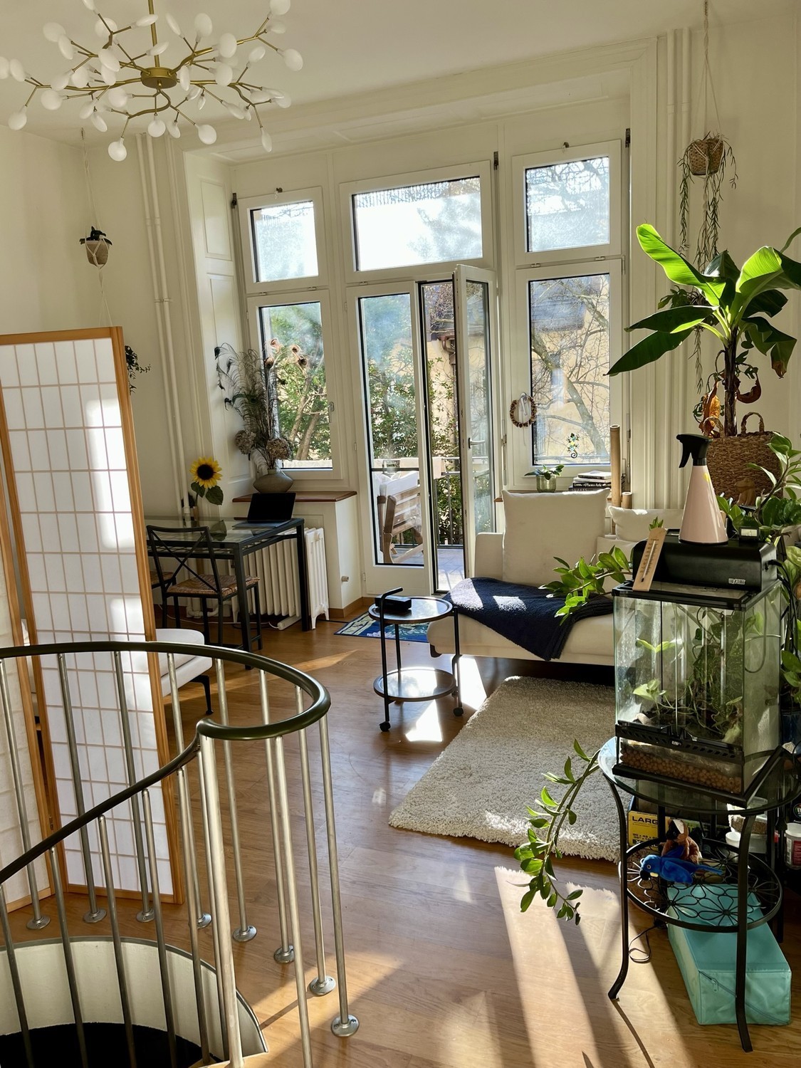 🌳 Jungendstil 2-story apartment with high ceilings and spacious balcony overlooking a serene green space. The private garden is framed by a towering magnolia and cherry tree, roses, hydrangeas, and other flowering bushes. The balcony overlooks the lush garden and nestbox for tits (fledging multiple Parus major clutches to boot).