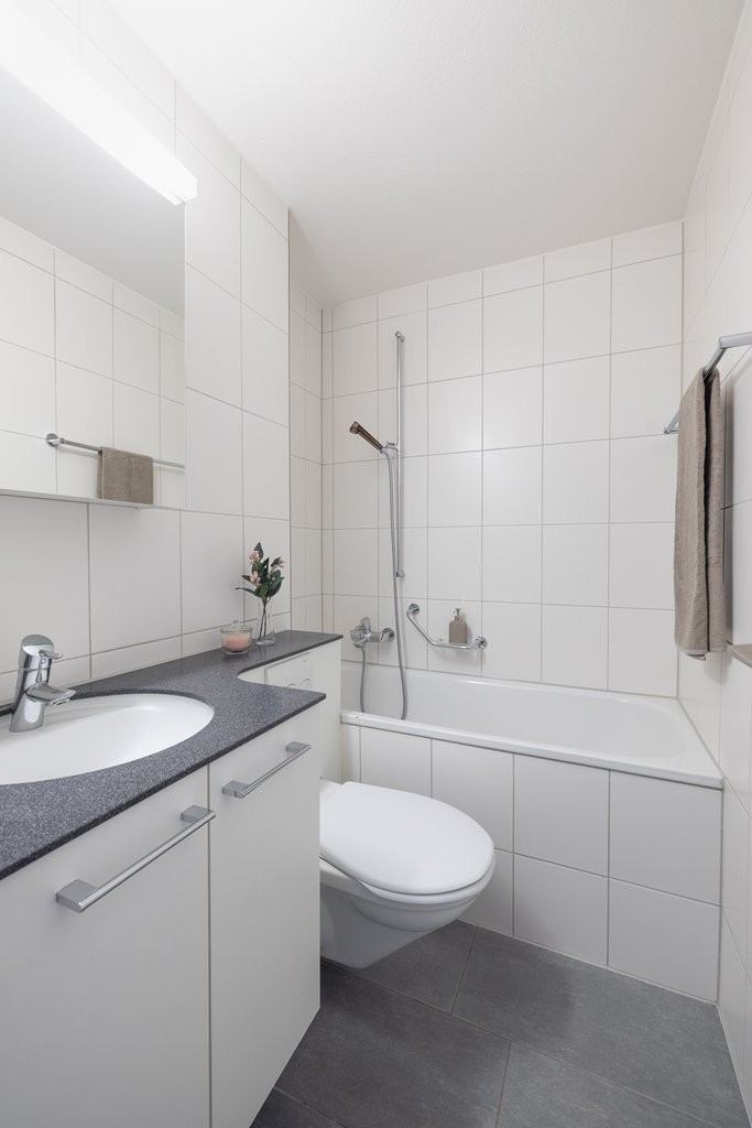 - Küche und Nasszelle mit pflegeleichtem, dunklem Plattenboden