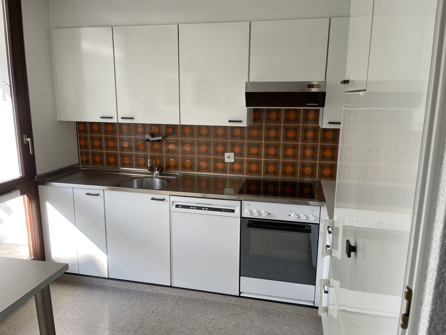 Küche mit Glaskeramikkochfeld, Backofen, Abwaschmaschine, Kühl- und Gefrierschrank