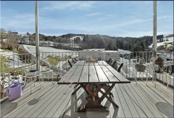 grosser sonniger Balkon, welcher einen perfekten Übergang von der Wohnung zur Natur ermöglicht