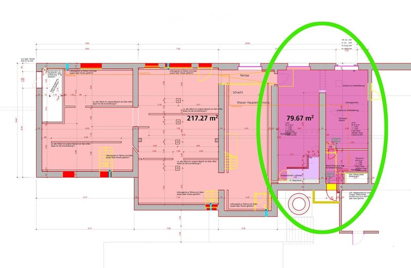 In den Bildern ist ein Grundriss ersichtlich. Die dunkelrot markierte Fläche entspricht der inserierten Mietfläche. Die rote Fläche ist eine halbhohe Fläche (ca. 1.40 m Raumhöhe), welche gemäss Mietvertrag zur kostenlosen Nutzung zur Verfügung steht.