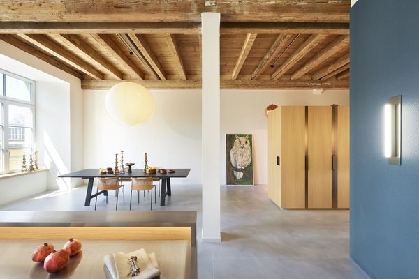 Die Wohneinheit mit rund 164 m² Wohnfläche ist über das gepflegte Treppenhaus oder per Aufzug erreichbar. Beim Betreten dieser Einheit fällt sofort das grosszügige Entrée ins Auge. Eine Vielzahl an massgefertigten Einbauschränken sorgt nicht nur für viel Stauraum, sondern auch für ein aufgeräumtes Wohnambiente. Die hohen Räume in Kombination mit den sandgestrahlten Holzbalken verleihen dem Bereich eine luftige Grosszügigkeit und eine besondere Atmosphäre. Der Gusszementboden in quarzgrau rundet das harmonische Gesamtbild ab. Direkt angrenzend an das Entrée öffnet sich der weitläufige Essbereich. Hier findet problemlos ein grosser Esstisch Platz - ideal für gesellige Abende mit Familie und Freunden. Die hochwertige Holzküche besticht durch ihre elegante Verarbeitung und die gelungene Kombination aus Funktionalität und Design. Neben grosszügigen Arbeitsflächen bietet sie reichlich Stauraum, sodass alle Küchenutensilien ihren Platz finden. Ergänzend sorgt die praktische Theke mit zusätzlichen Schränken für weitere Ablage- und Aufbewahrungsmöglichkeiten. Direkt daneben liegt das Reduit, das als Abstellfläche und Keller dieser Einheit dient und mit Waschmaschine, Tumbler sowie einem Spültrog ausgestattet ist.