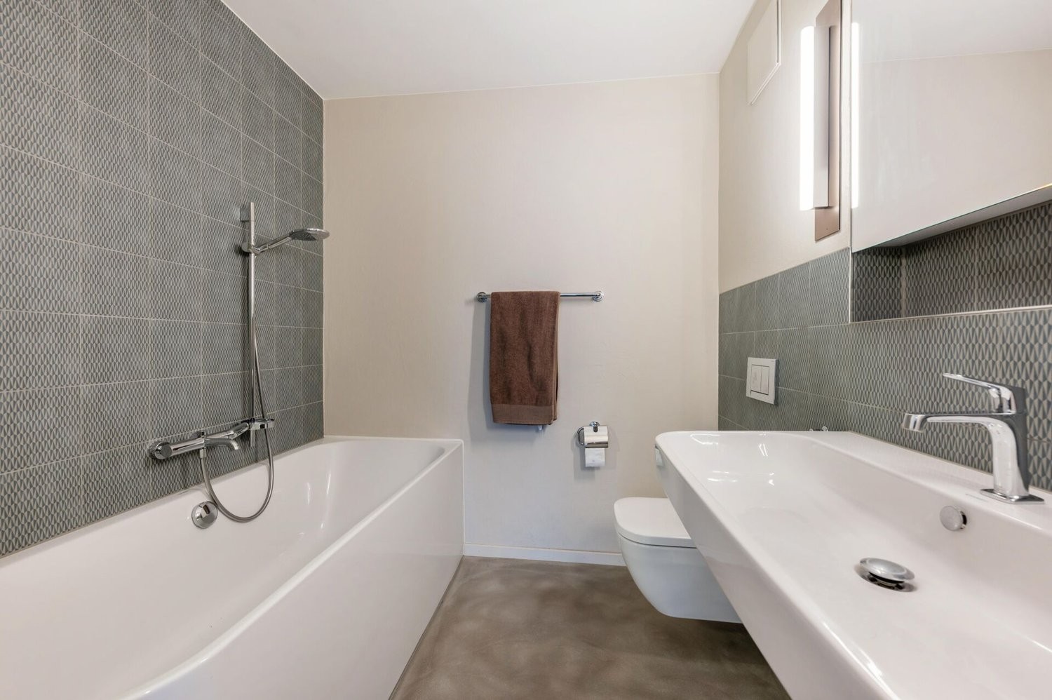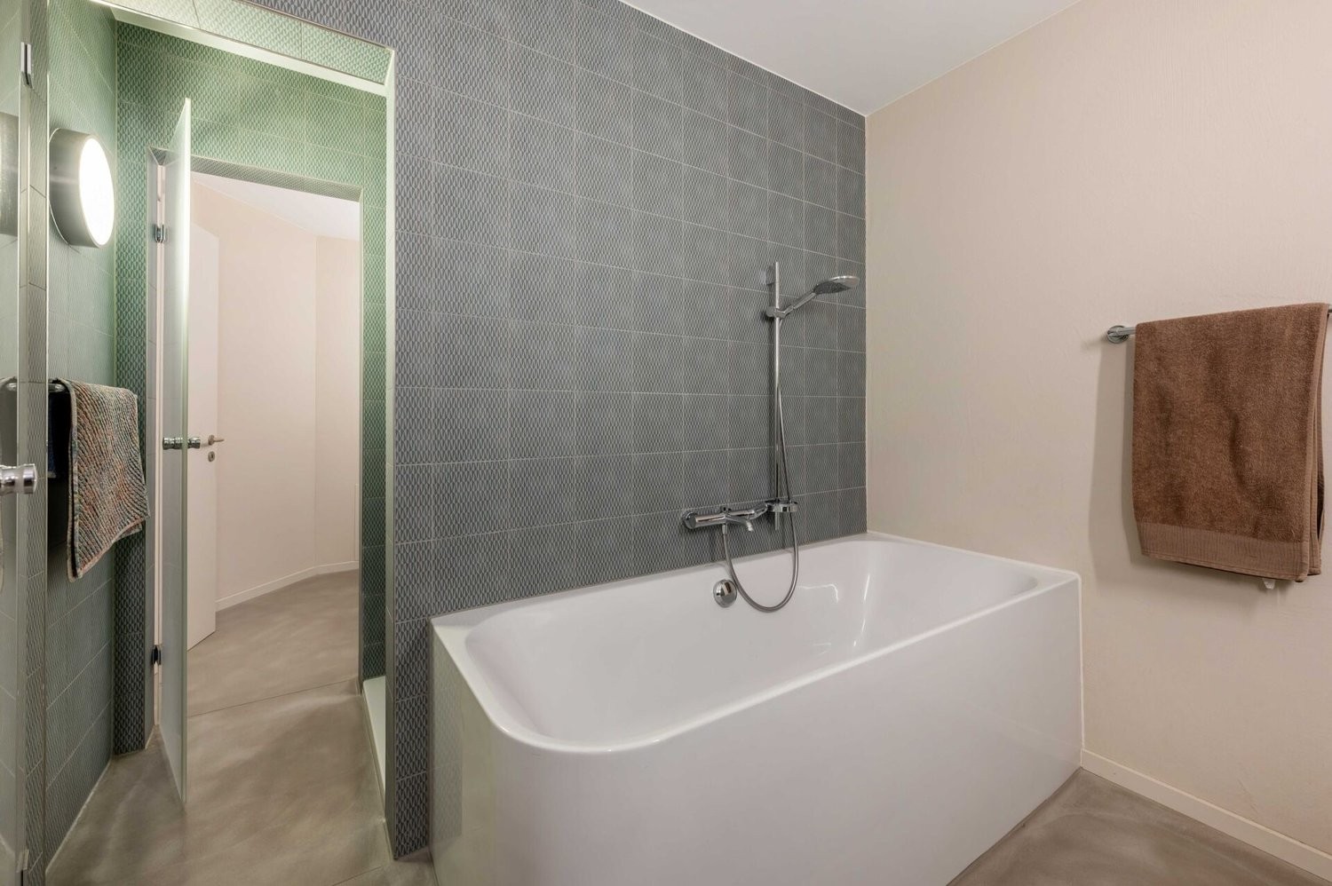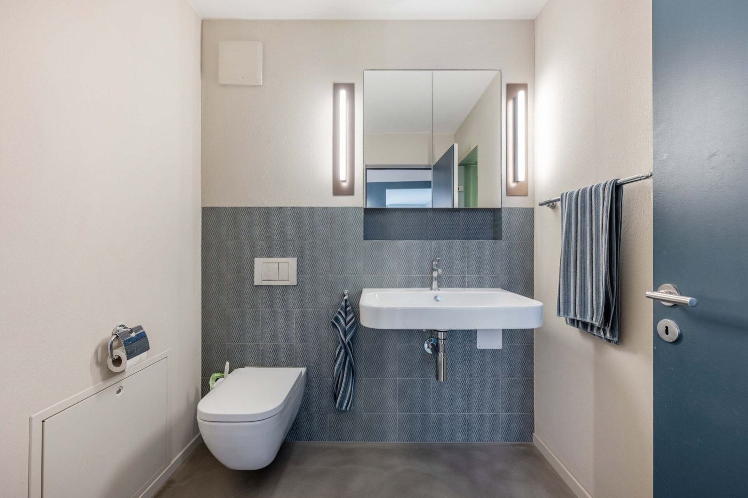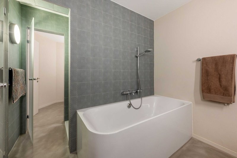 Nur wenige Treppenstufen führen hinauf auf ein Halbgeschoss, wo sich der offene Wohnbereich befindet. Dieser ist mit edlem, gebürstetem Eiche Parkett ausgestattet und überzeugt durch seine helle, einladende Atmosphäre. Eine geschickt platzierte Dusche verbindet die beiden Nassräume auf praktische Weise. Beide sind mit Toilette, Lavabo und Spiegelschrank ausgestattet, wobei einer der Nassräume zusätzlich über eine Badewanne verfügt. Die drei Zimmer ermöglichen jeweils einen direkten Zugang zur grosszügigen Terrasse. Diese bietet nicht nur viel Platz zum Verweilen, sondern auch einen lauschigen Sitzplatz mit herrlichem Blick auf die Reuss - ein perfekter Ort, um Ruhe und Natur zu geniessen.