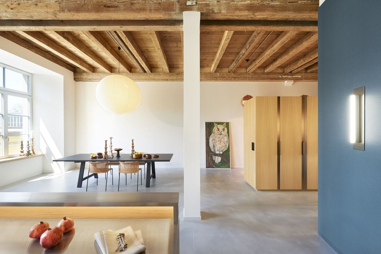 Die Wohneinheit mit rund 164 m² Wohnfläche ist über das gepflegte Treppenhaus oder per Aufzug erreichbar. Beim Betreten dieser Einheit fällt sofort das grosszügige Entrée ins Auge. Eine Vielzahl an massgefertigten Einbauschränken sorgt nicht nur für viel Stauraum, sondern auch für ein aufgeräumtes Wohnambiente. Die hohen Räume in Kombination mit den sandgestrahlten Holzbalken verleihen dem Bereich eine luftige Grosszügigkeit und eine besondere Atmosphäre. Der Gusszementboden in quarzgrau rundet das harmonische Gesamtbild ab. Direkt angrenzend an das Entrée öffnet sich der weitläufige Essbereich. Hier findet problemlos ein grosser Esstisch Platz - ideal für gesellige Abende mit Familie und Freunden. Die hochwertige Holzküche besticht durch ihre elegante Verarbeitung und die gelungene Kombination aus Funktionalität und Design. Neben grosszügigen Arbeitsflächen bietet sie reichlich Stauraum, sodass alle Küchenutensilien ihren Platz finden. Ergänzend sorgt die praktische Theke mit zusätzlichen Schränken für weitere Ablage- und Aufbewahrungsmöglichkeiten. Direkt daneben liegt das Reduit, das als Abstellfläche und Keller dieser Einheit dient und mit Waschmaschine, Tumbler sowie einem Spültrog ausgestattet ist.
