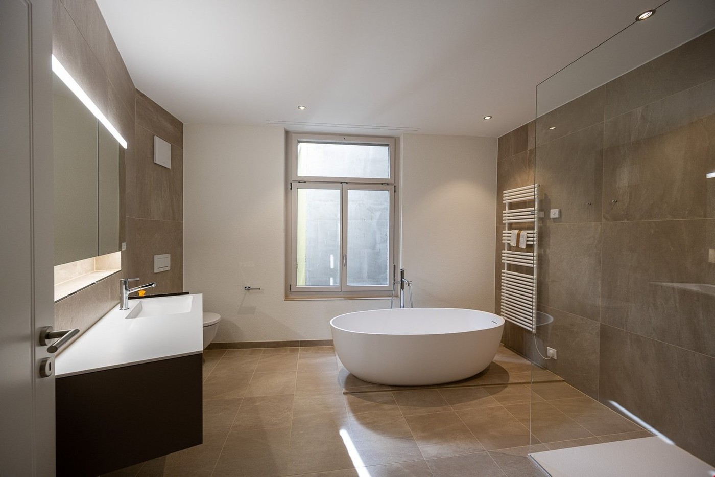 Das Badezimmer ist mit einer freistehenden Badewanne, begehbarer Dusche und Schweizer Talsee-Möbel ausgestattet, dies ermöglicht Ihnen ein traumhaftes Oasegefühl bei jedem Gang ins Badezimmer. Selbstverständlich finden Sie ein Tüchliwärmer vor, damit Sie immer ein warmes Frottiertuch haben.