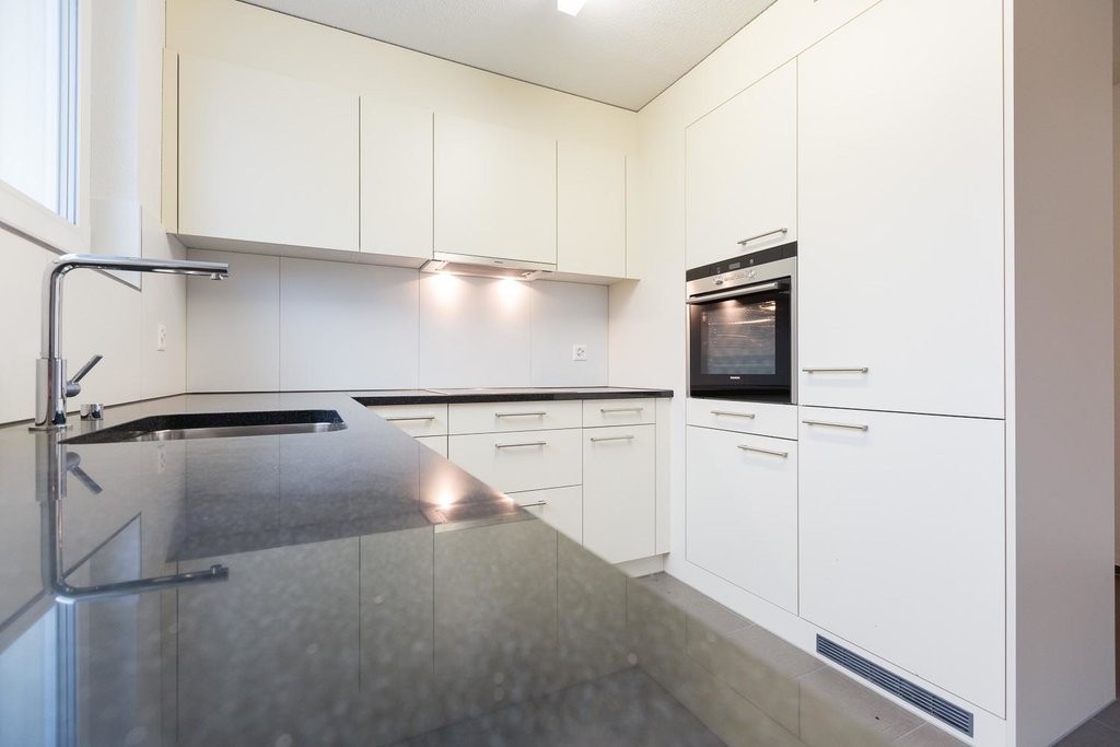 - Küche und Nasszellen mit pflegeleichtem, dunklem Plattenboden