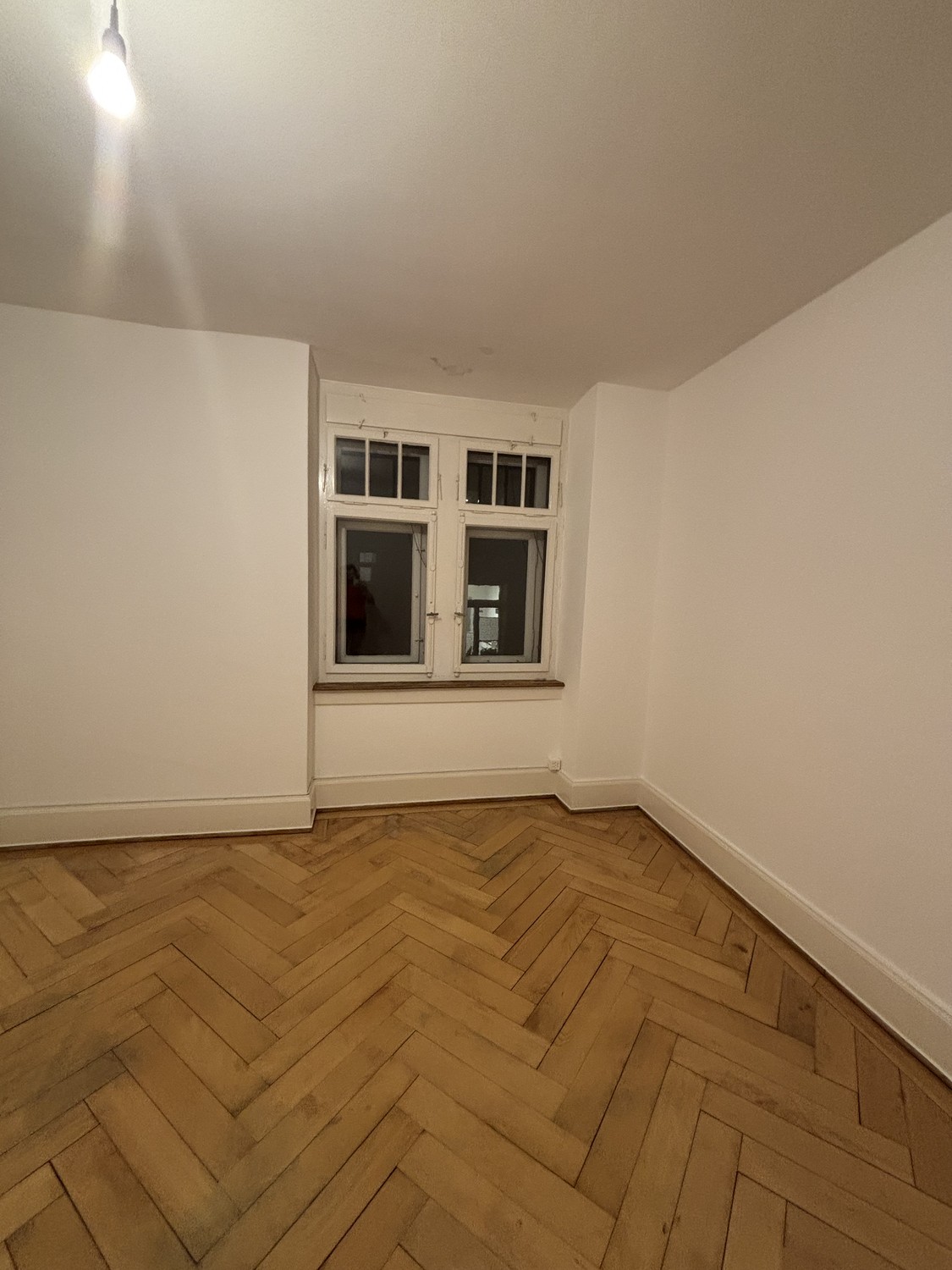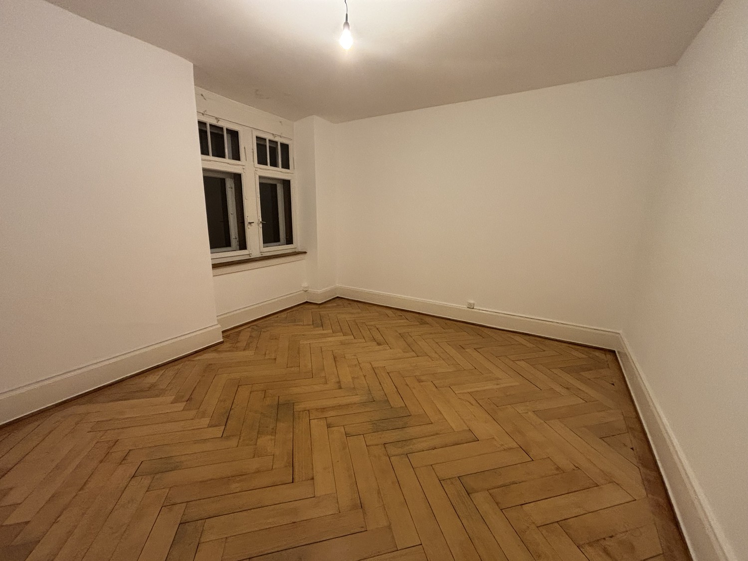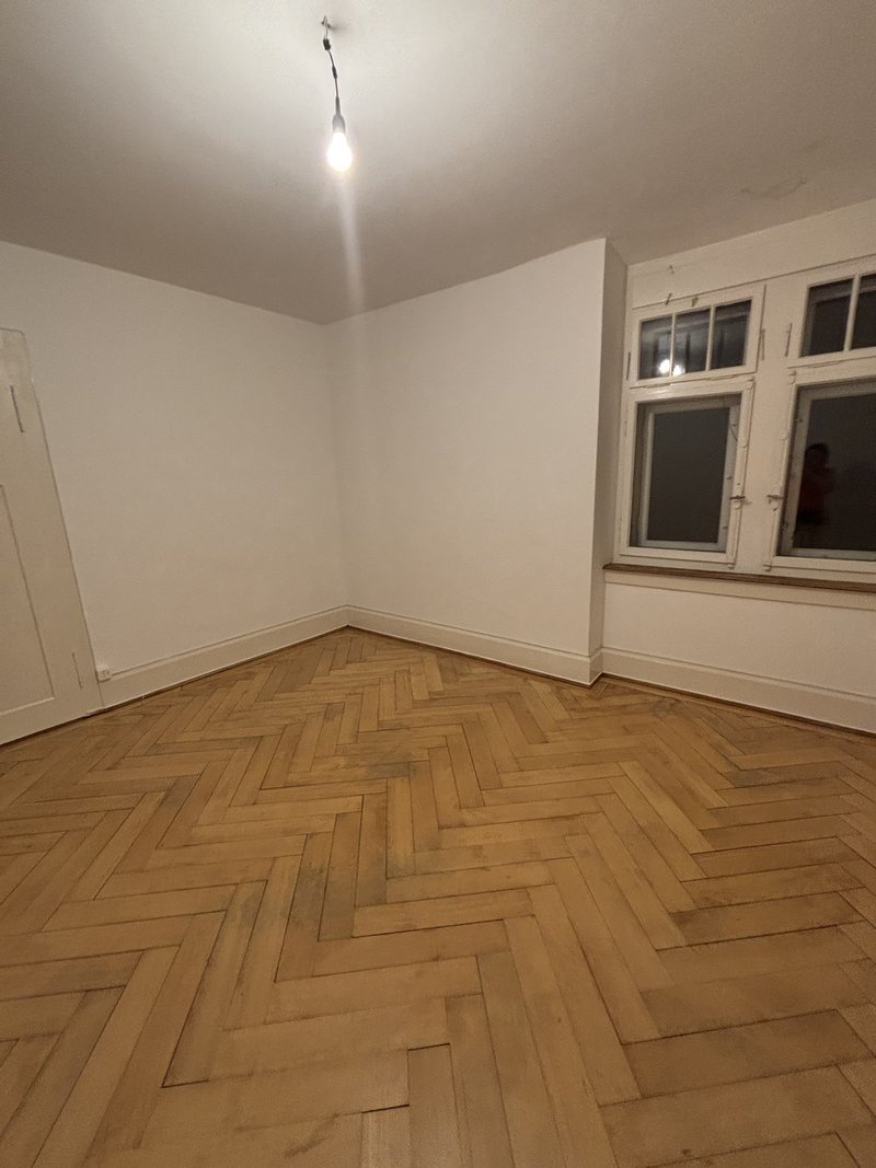 The flat comprises two living rooms, a kitchen, and a bathroom. The period building (Altbau) dates back to around 1910 and features original herringbone parquet flooring in the living areas, with terrazzo stone floors in the kitchen and bathroom.