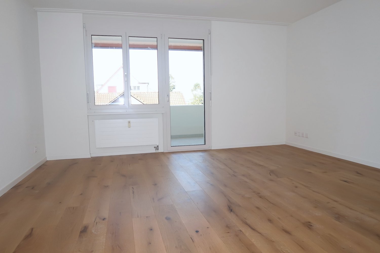 Helles Wohn-/Schlafzimmer mit neuem Parkettboden und Zugang zum Balkon