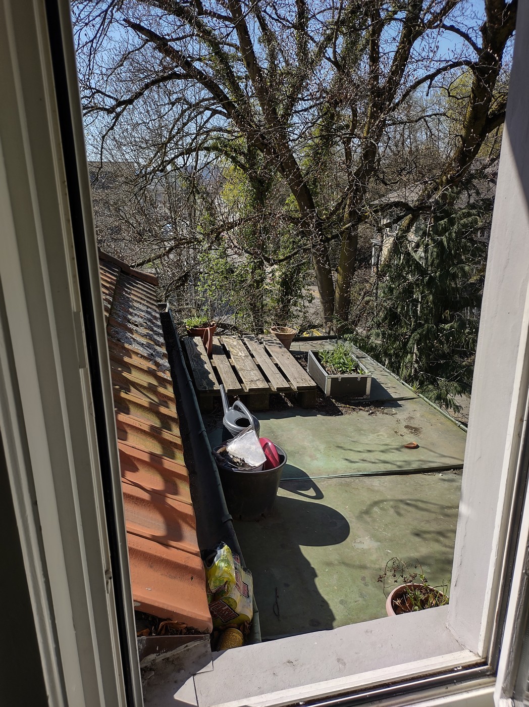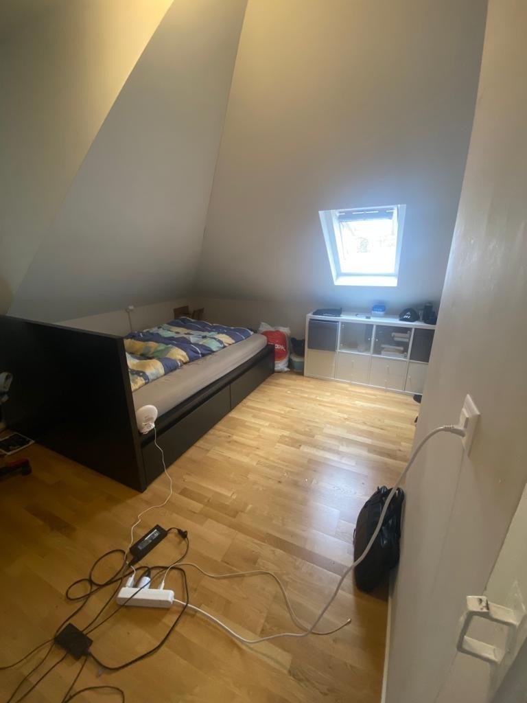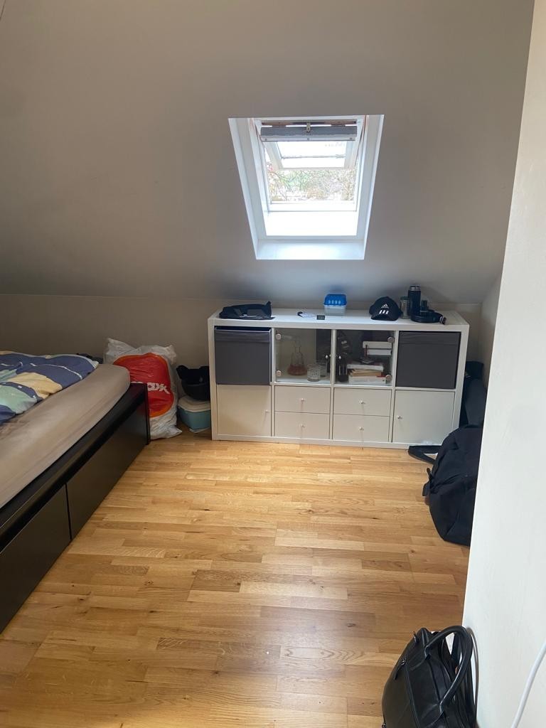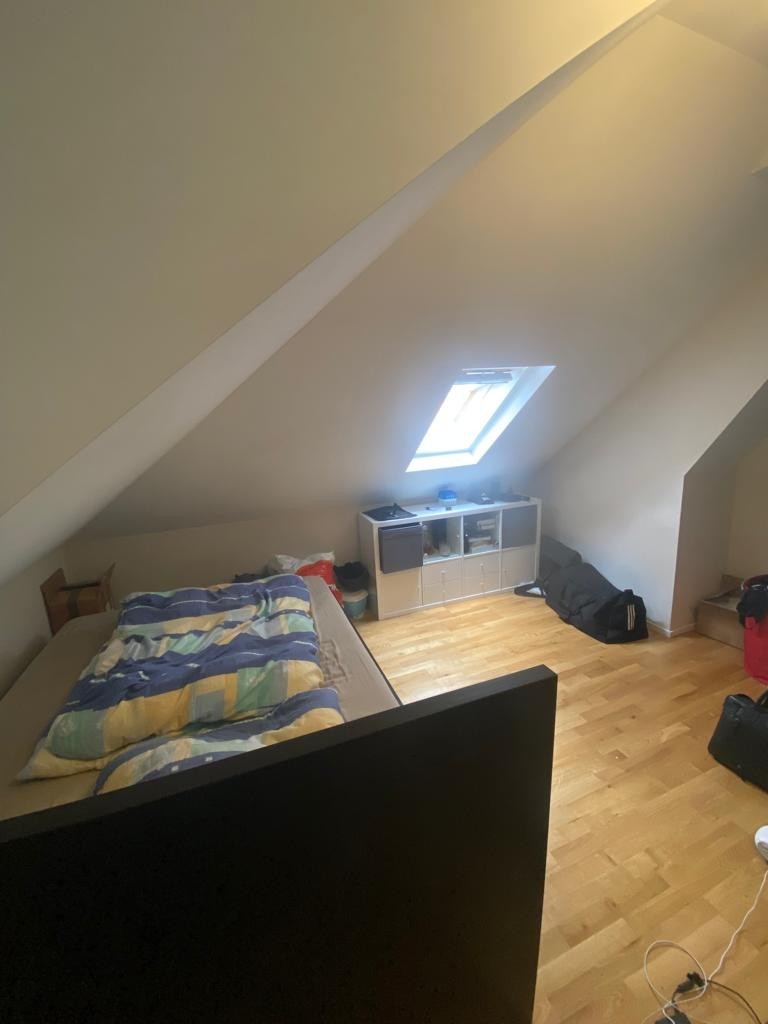 Dein Zimmer ist ca. 13m2 gross, hat ein Fenster und ein Dachfenster. Das Dachfenster hat Blick auf unseren Dachvorsprung, den wir im Sommer auch gerne als Balkon nutzen.