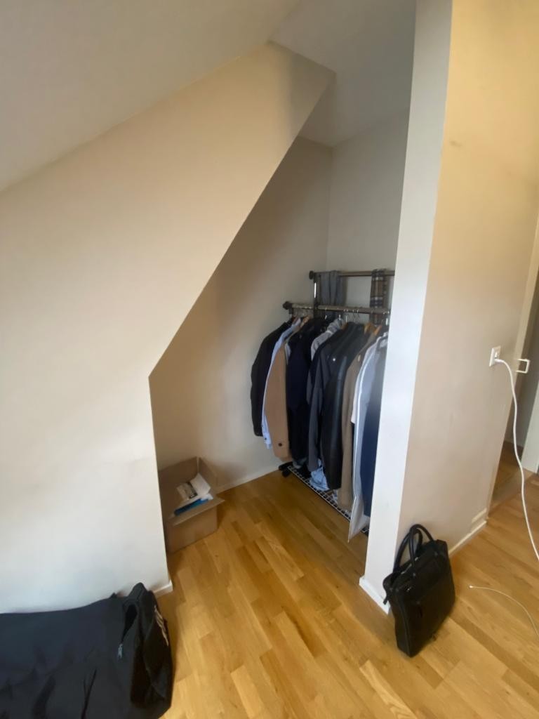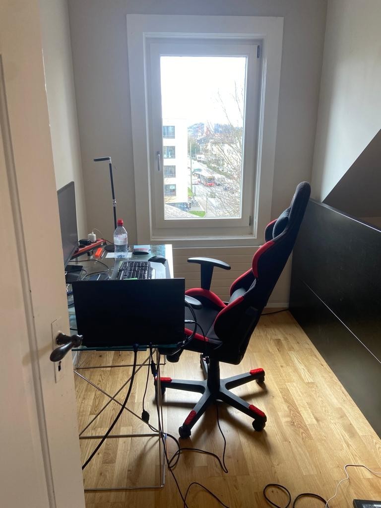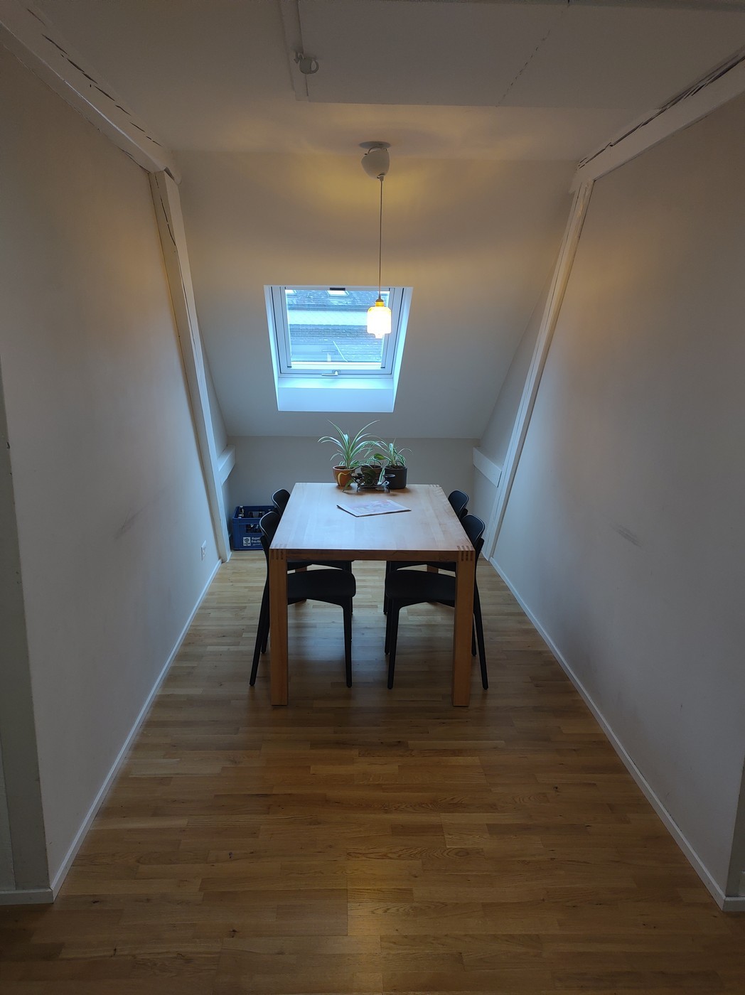 Dein Zimmer ist ca. 13m2 gross, hat ein Fenster und ein Dachfenster. Das Dachfenster hat Blick auf unseren Dachvorsprung, den wir im Sommer auch gerne als Balkon nutzen.