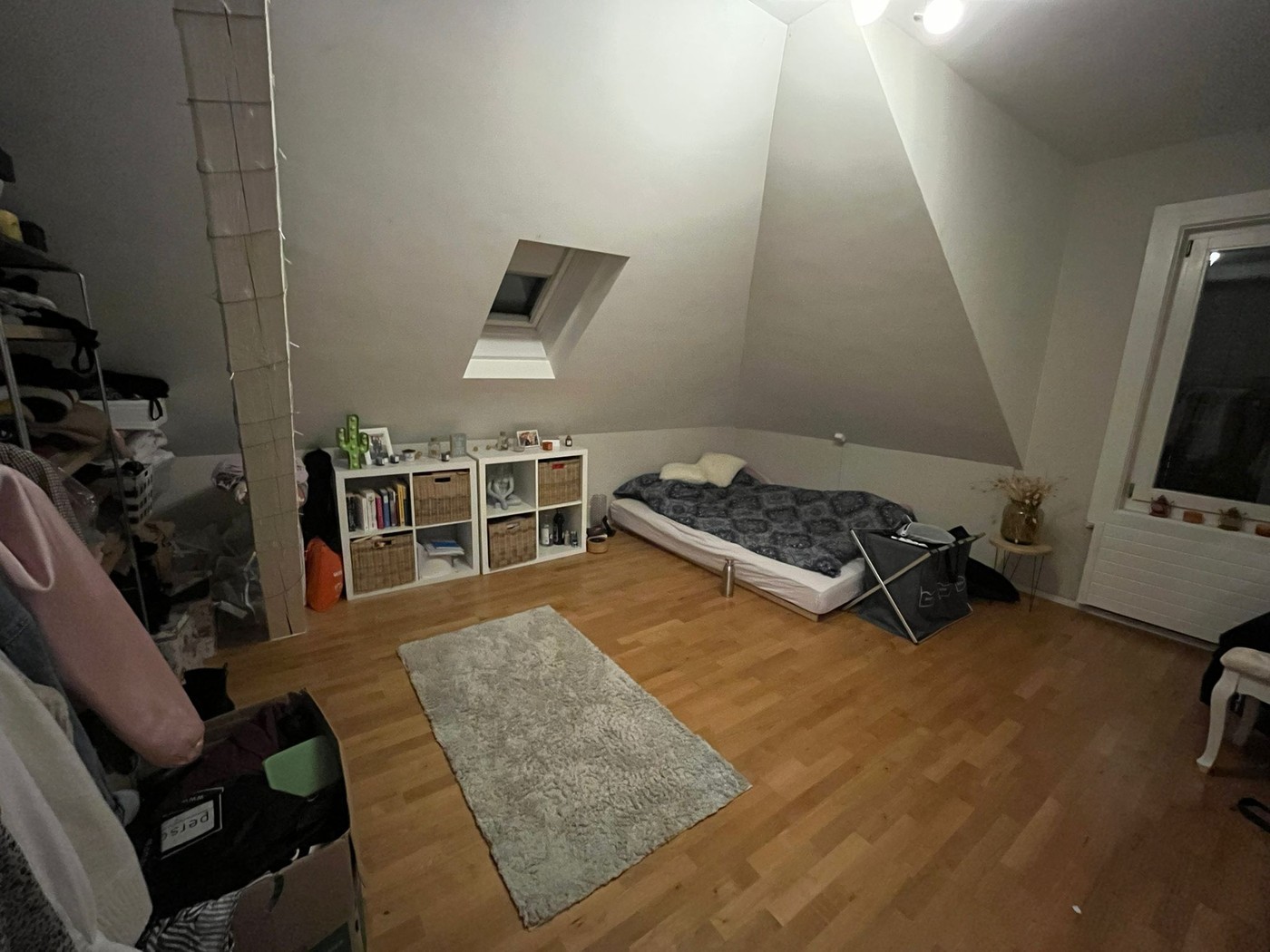 Dein Zimmer ist ca. 16m2 gross, hat ein Fenster und ein Dachfenster.