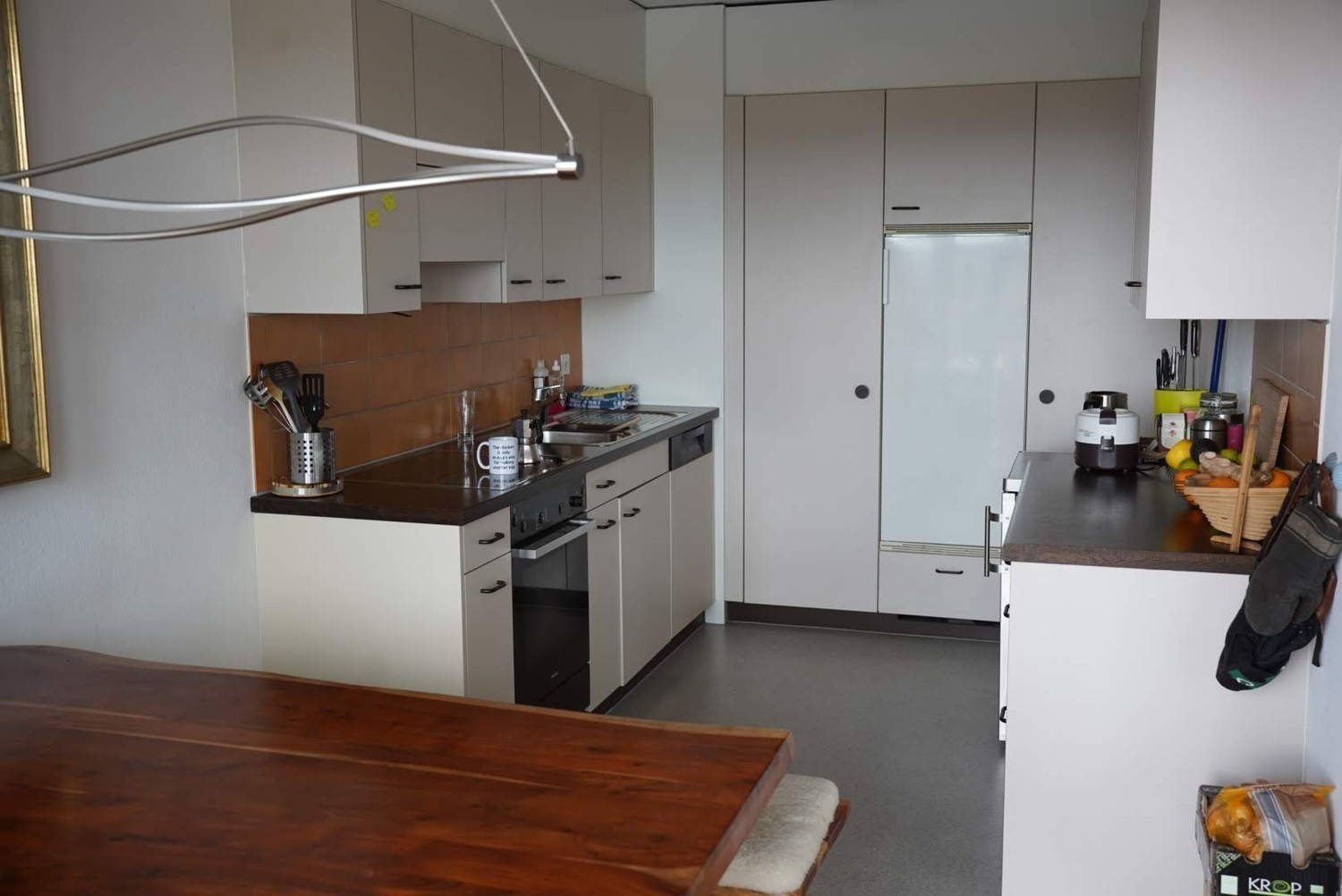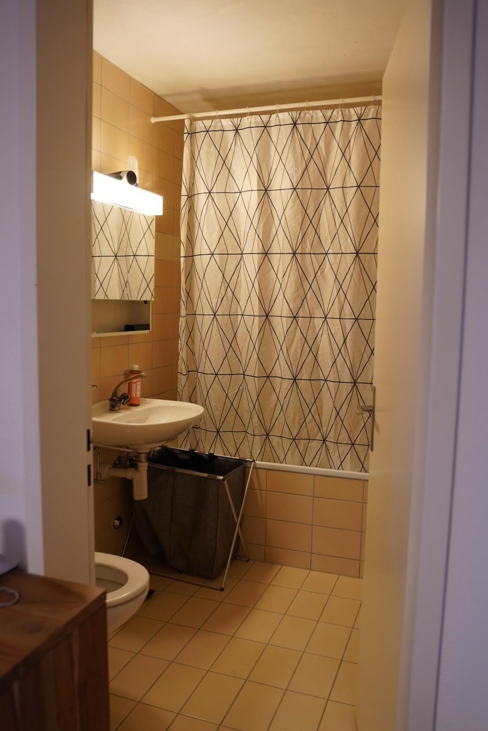 The apartment features a spacious entrance area, a bathroom with toilet, an additional separate toilet, and a large living room with access to the balcony. The balcony offers a direct view of the Rhine and enjoys morning sun until around 1:00 pm. There is also a generously sized kitchen even if it’s not the newest one ;).