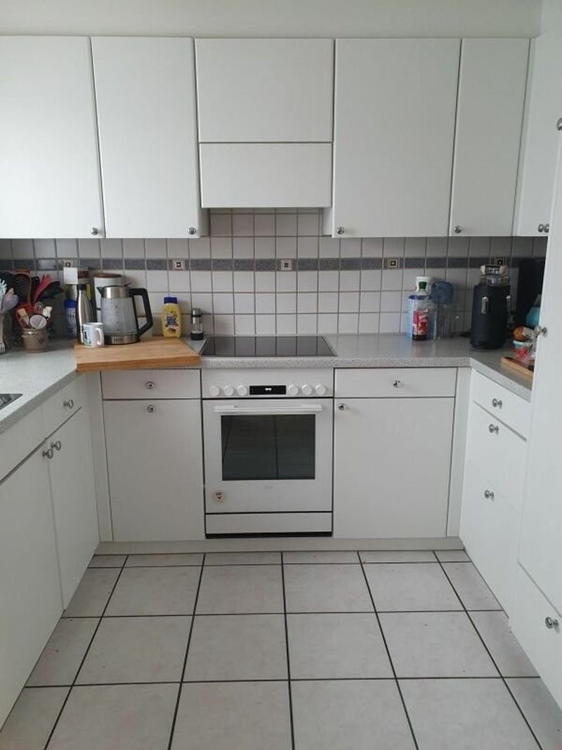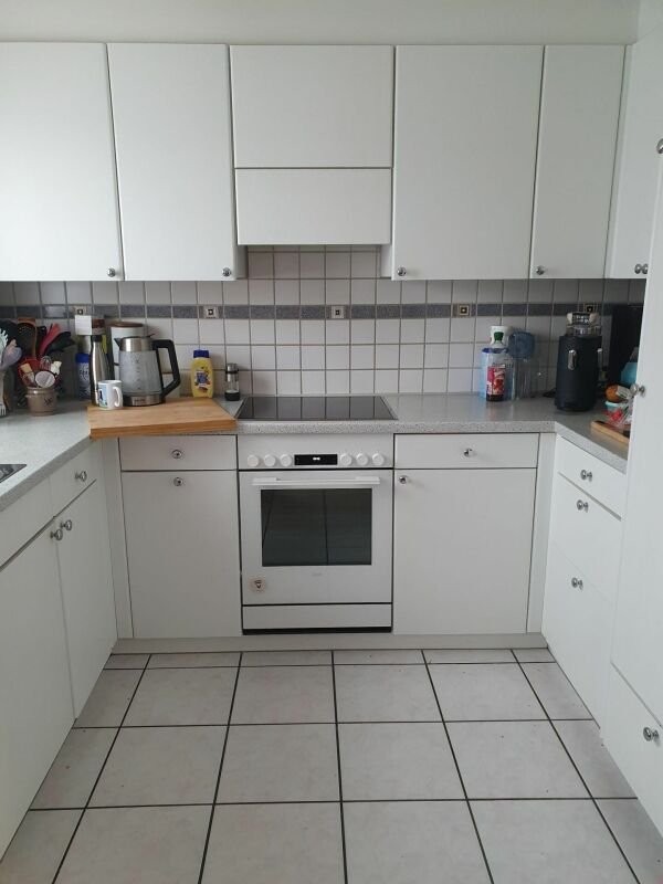 Küche mit Glaskeramikkochfeld, Backofen und Einbaukühlschrank