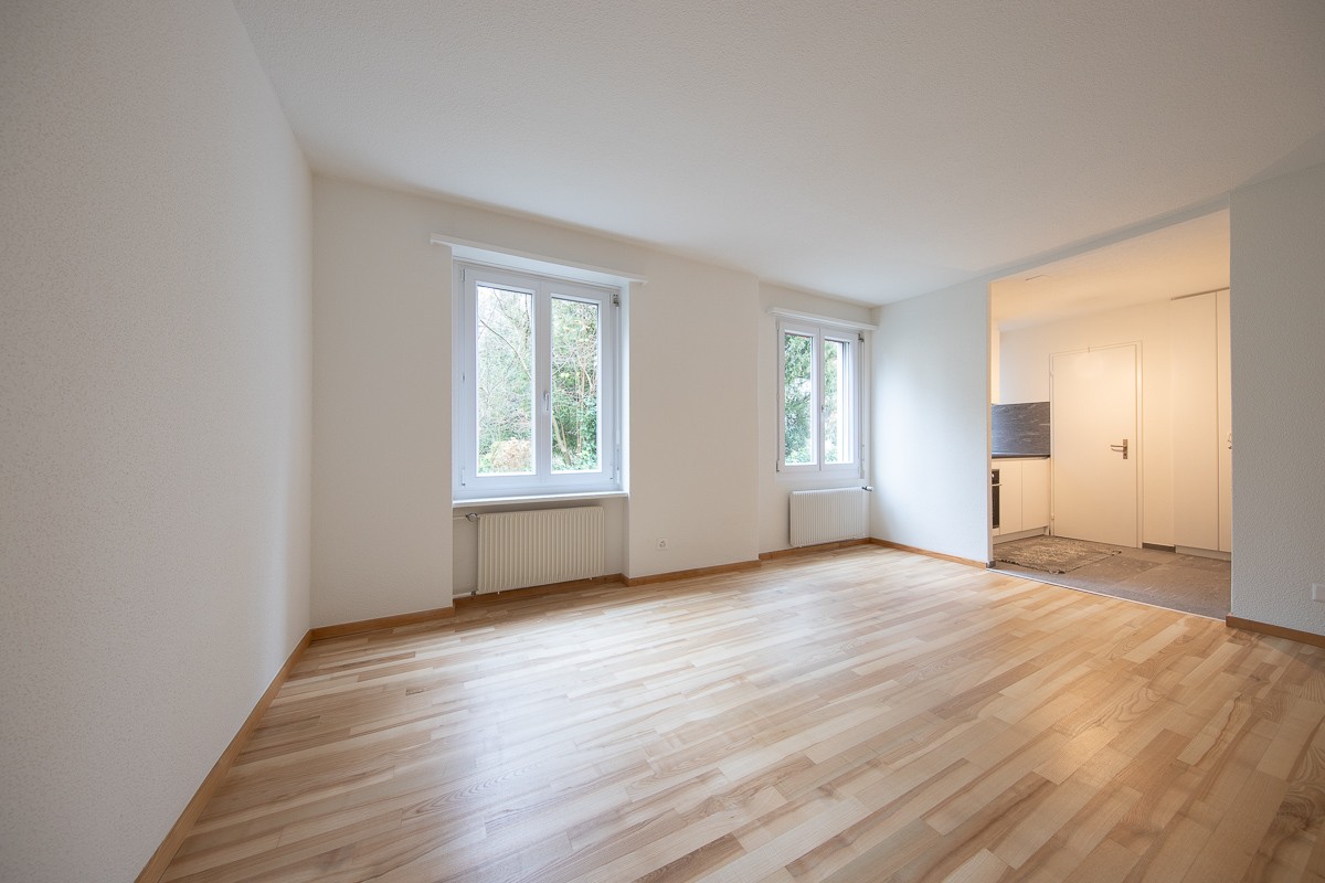Der Wohn-/Schlafraum überzeugt durch einen gepflegten Parkettboden, der eine warme und angenehme Wohnatmosphäre schafft. Die gesamte Wohnung wurde kürzlich renoviert und präsentiert sich in einem schönen Zustand.