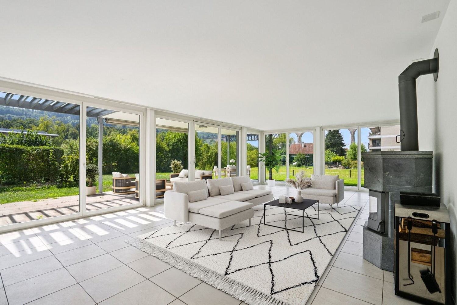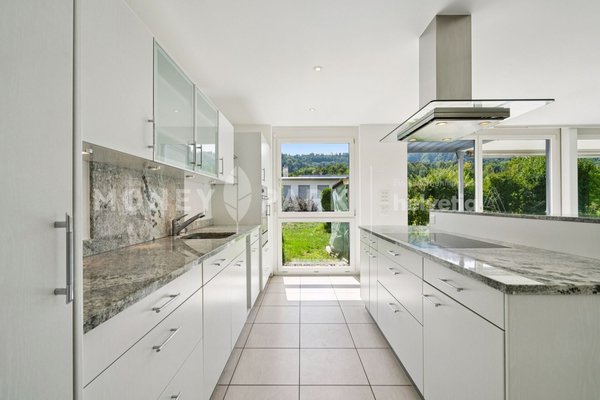 Beim Betreten empfängt Sie ein heller Eingangsbereich mit praktischen Einbauschränken, der direkt in den grosszügigen Wohn- und Essbereich führt. Raumhohe Fensterfronten mit dreifacher Isolierverglasung lassen viel Tageslicht herein und eröffnen den Blick auf den Viadukt. Die moderne Küche mit Kochinsel fügt sich harmonisch in den offenen Wohnraum mit Schwedenofen ein. Von hier aus gelangen Sie auf die Terrasse und in den Garten.