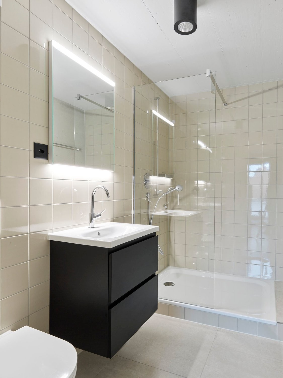 Zeitgemässes Badezimmer: Mit weissen Fliesen, schwarzem Waschtisch und moderner Glasdusche