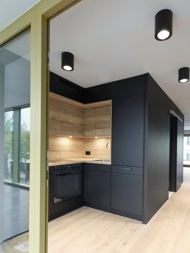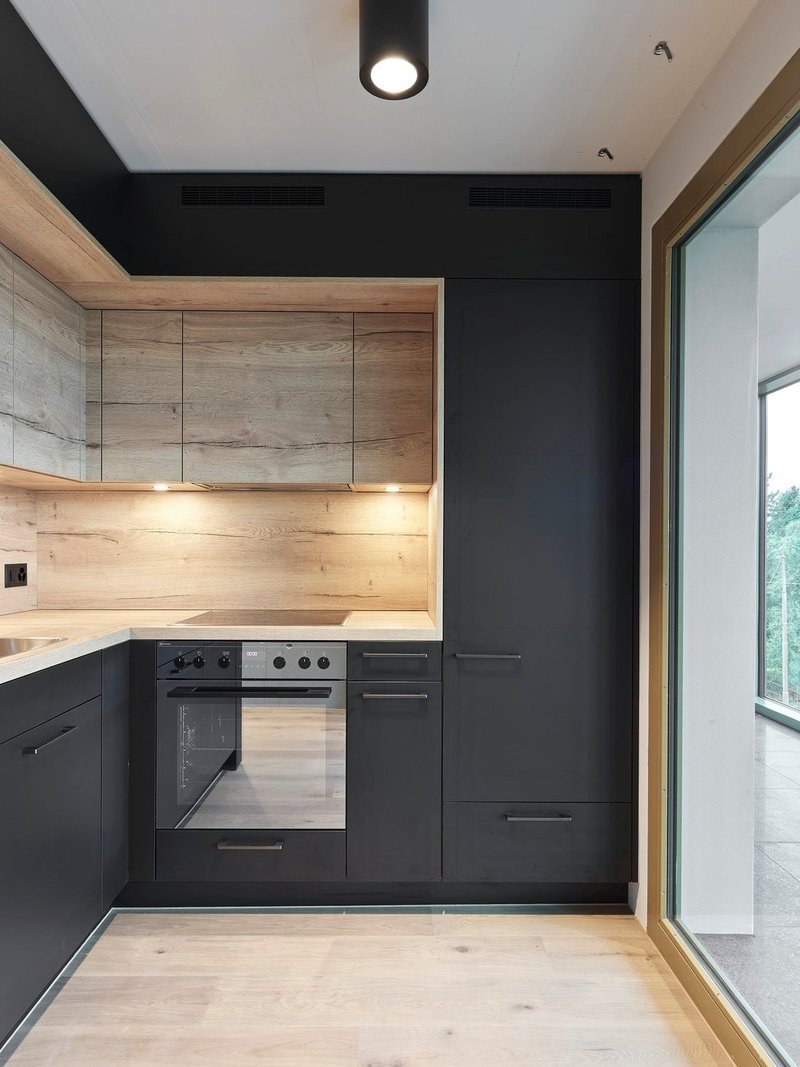 Moderne Küche: Stilvolle schwarze Küchenschränke mit Holzrückwand, eingebautem Backofen und Geschirrspüler sowie einem grossen Fenster für viel Tageslicht
