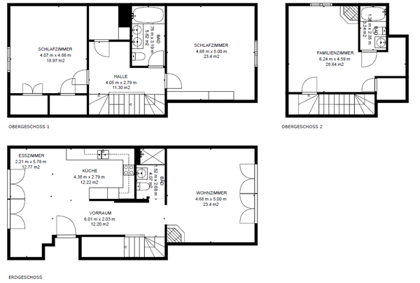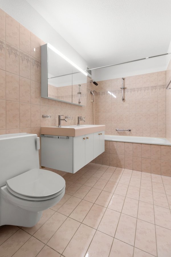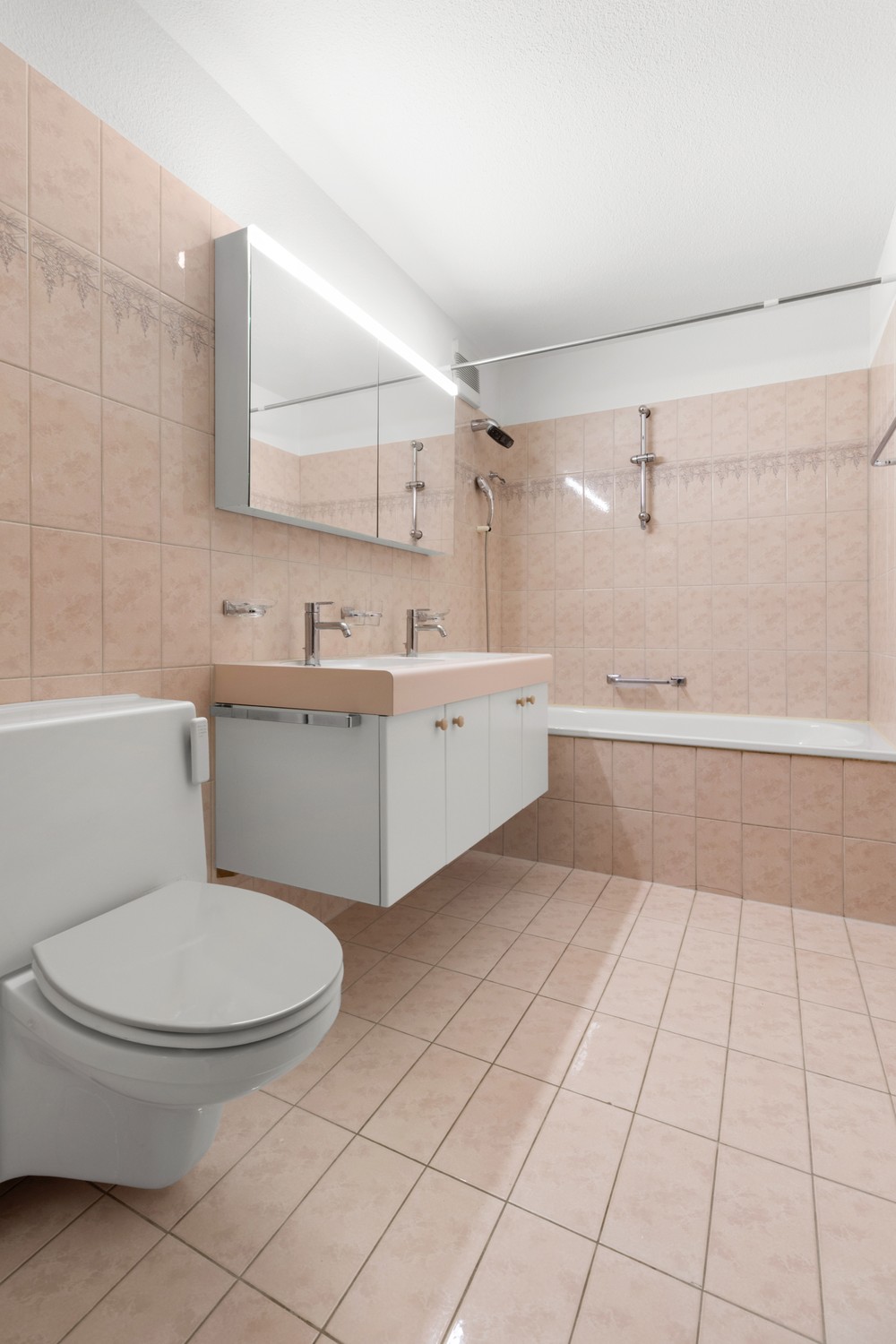 Badezimmer mit Badewanne, Doppellavabo und WC