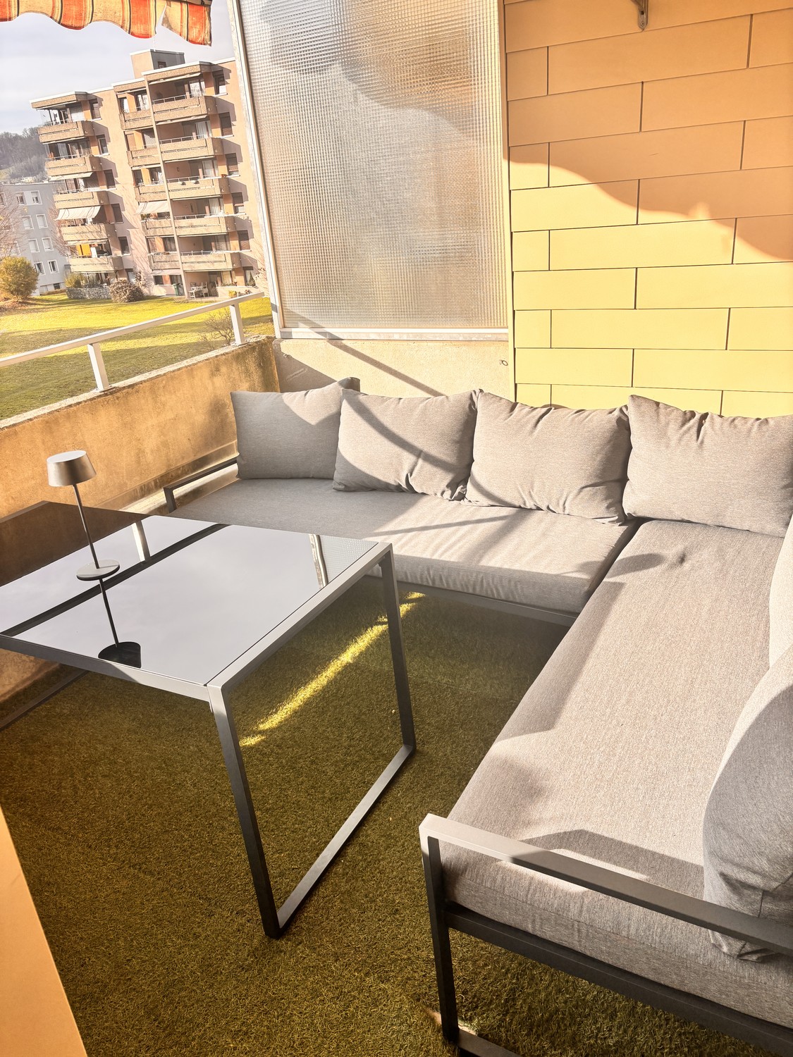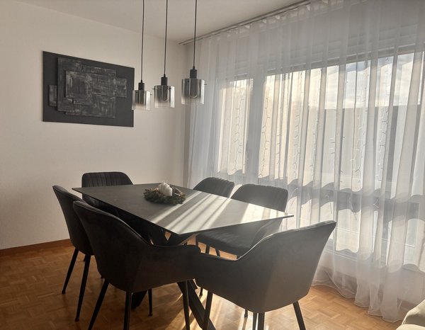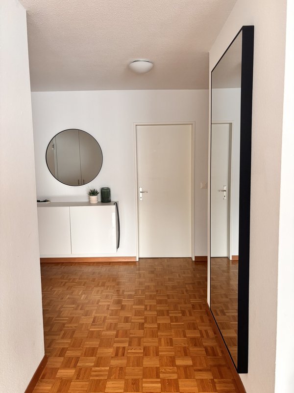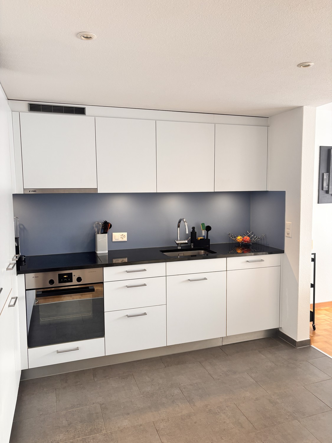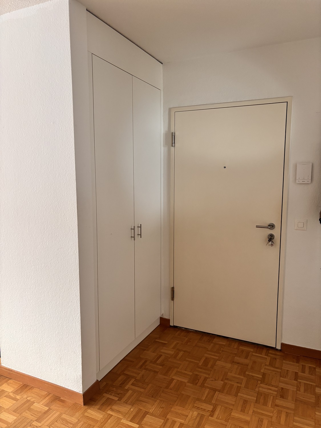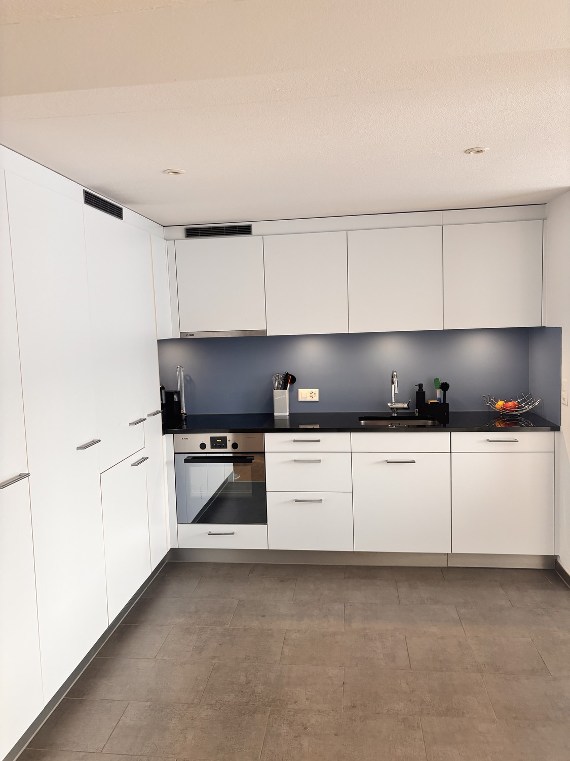 Die Küche verfügt über ein Glaskeramik-Kochfeld, Kühlschrank, Backofen und Geschirrspüler. Die Einbauschränke im Eingangsbereich bieten viel praktischen Stauraum. Der grosse Balkon mit Blick ins Grüne und Abendsonne lädt zum Verweilen ein.