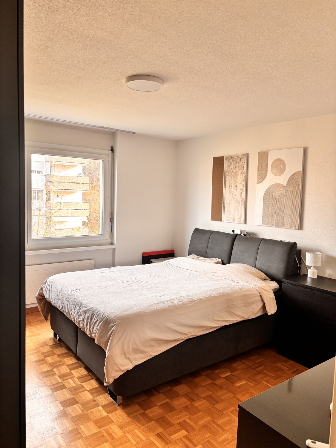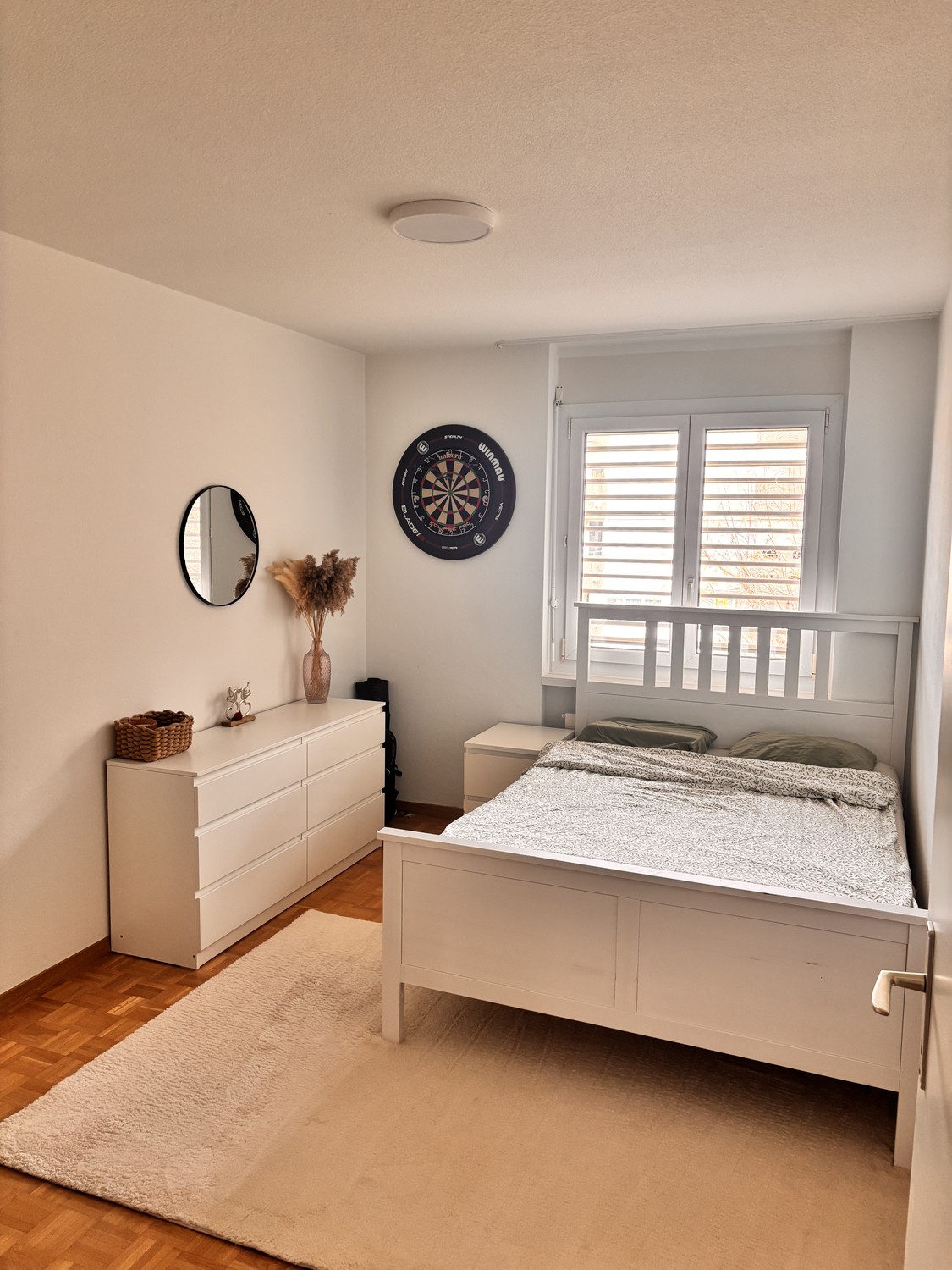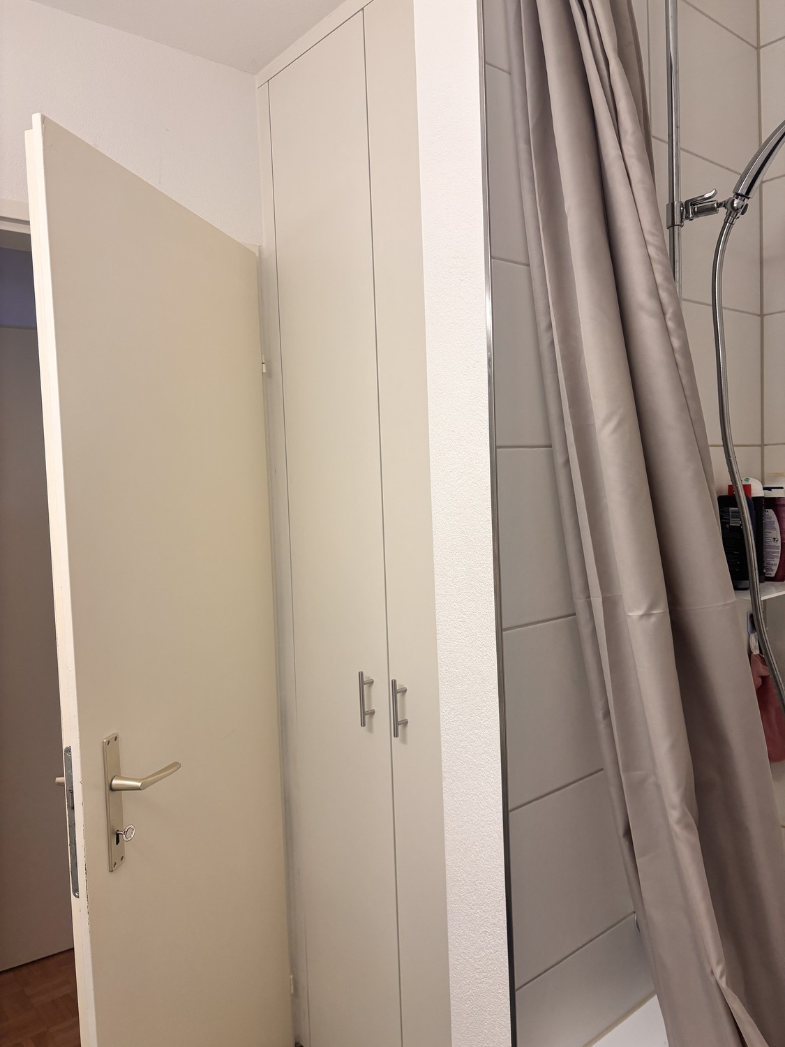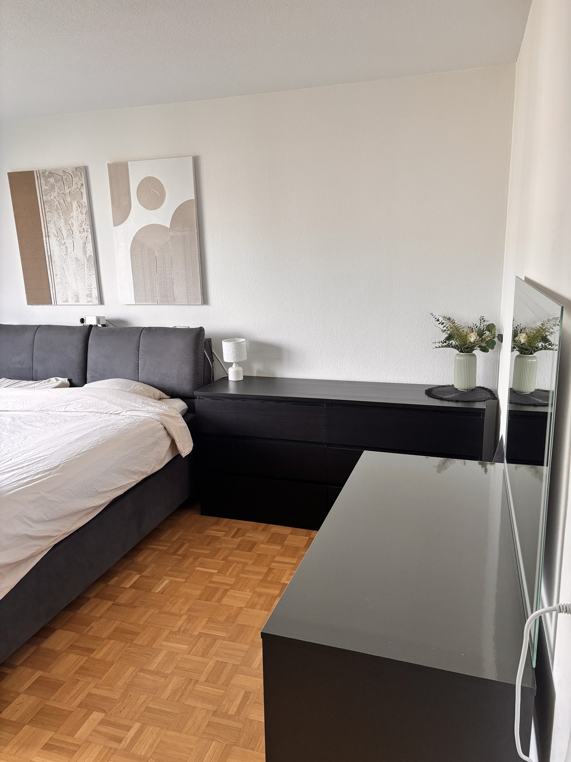 Die Küche verfügt über ein Glaskeramik-Kochfeld, Kühlschrank, Backofen und Geschirrspüler. Die Einbauschränke im Eingangsbereich bieten viel praktischen Stauraum. Der grosse Balkon mit Blick ins Grüne und Abendsonne lädt zum Verweilen ein.