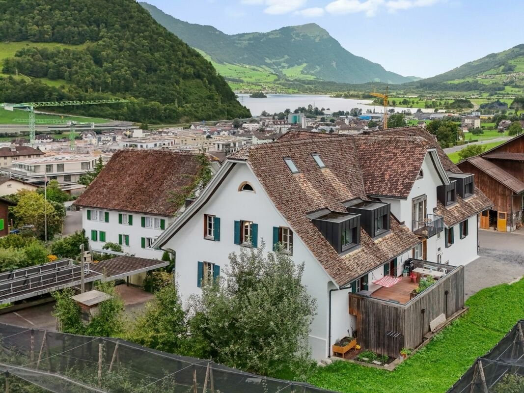 Diese Wohnung vereint auf einzigartige Weise stilvolles Design mit rustikalem Charme und viel Privatsphäre. Sichtbalken, Naturafloor-Beläge in den Nasszellen und teilweise in den Wohnräumen sowie weitere hochwertige Materialien schaffen eine warme, moderne Wohnatmosphäre mit Charakter. Die offene Küche mit Wok-Kochfeld, Dampfdrucksteamer, Quooker und grossem Side-by-Side-Kühlschrank lässt keine Wünsche offen. Der angrenzende Wohnbereich mit Cheminée lädt zum Verweilen ein und öffnet sich zu zwei sonnigen Balkonen: Einer bietet einen herrlichen Ausblick auf den Lauerzersee und die Stadt Schwyz, der andere eröffnet den Blick auf die majestätischen Mythen und ins saftige Grün der angrenzenden Landwirtschaftszone - perfekte Kulissen für entspannte Stunden im Freien.