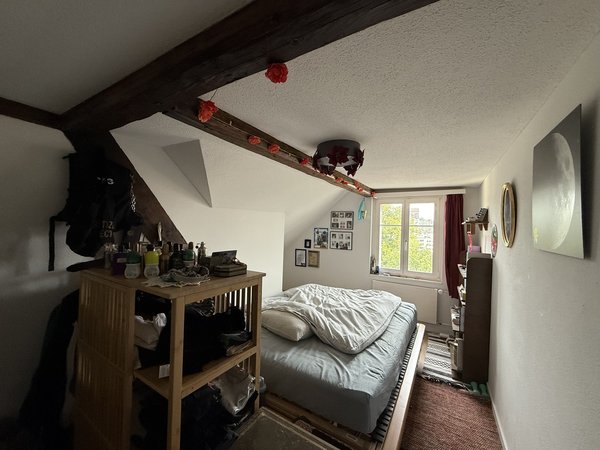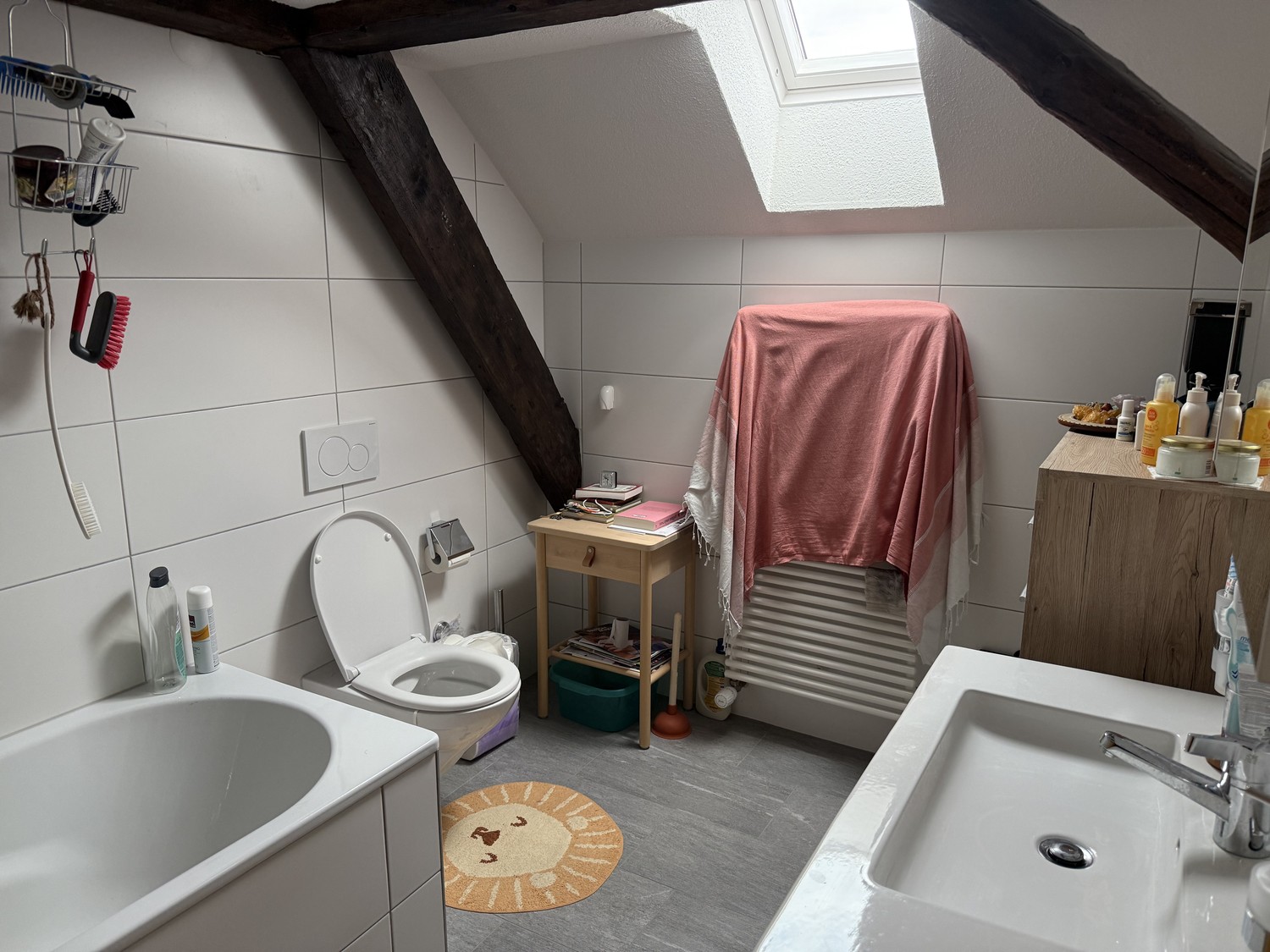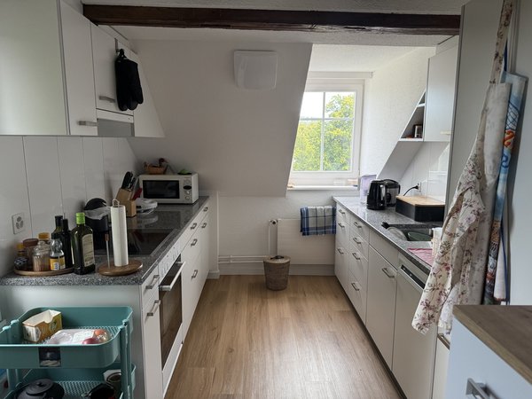 Die Wohnung ist im 3. Stock (ohne Lift), hat einen Geschirrspüler, einen grossen Tiefkühler und Kühlschrank, ein modernes Bad, einen Garten zur Mitbenutzung, einen schönen, geräumigen Estrich, der nur uns gehört, ein gutes Kellerabteil und im Waschraum hat es sowohl Tumbler als auch Secomat.
