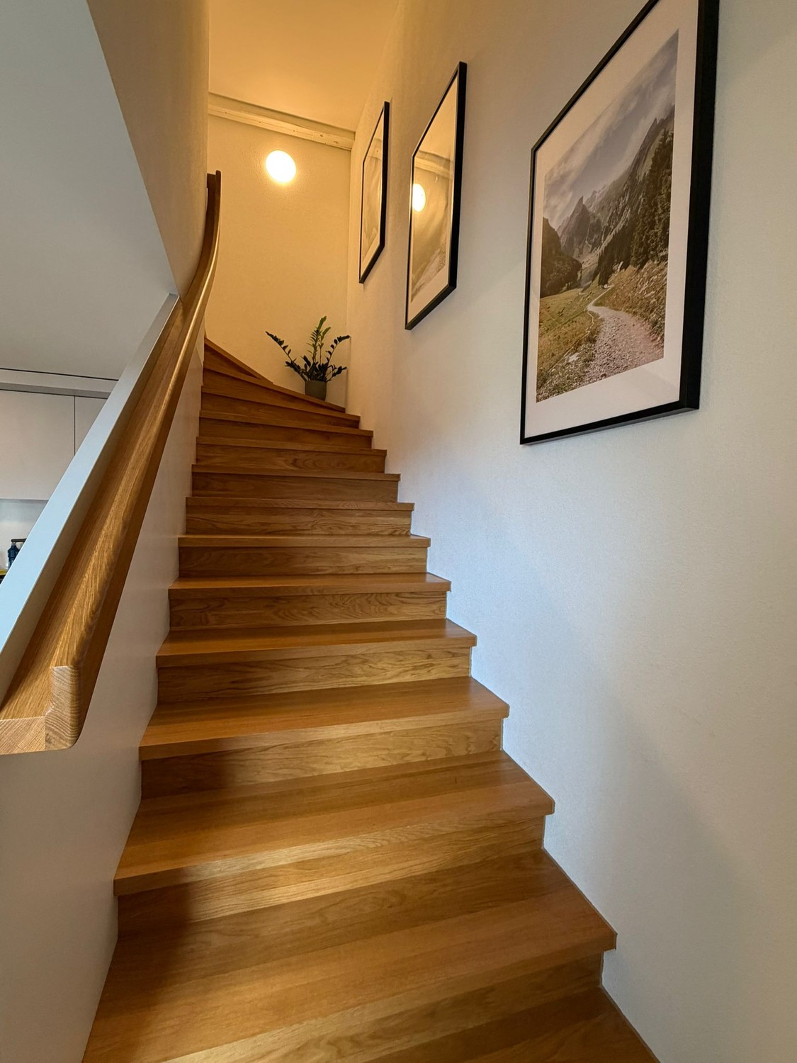 Durch die zwei Etagen fühlt sich die Wohnung sehr grosszügig an – unten wird gequatscht oder gebruncht, oben kann man sich zurückziehen.