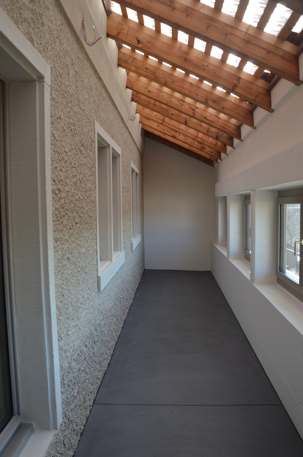 Die Wohnung befindet sich im 4. OG, Lift vorhanden. Sie hat drei Schlafzimmer, 1x Dusche/WC, 1x separates WC, private Terrasse 34m2 und eine Loggia 12m2.