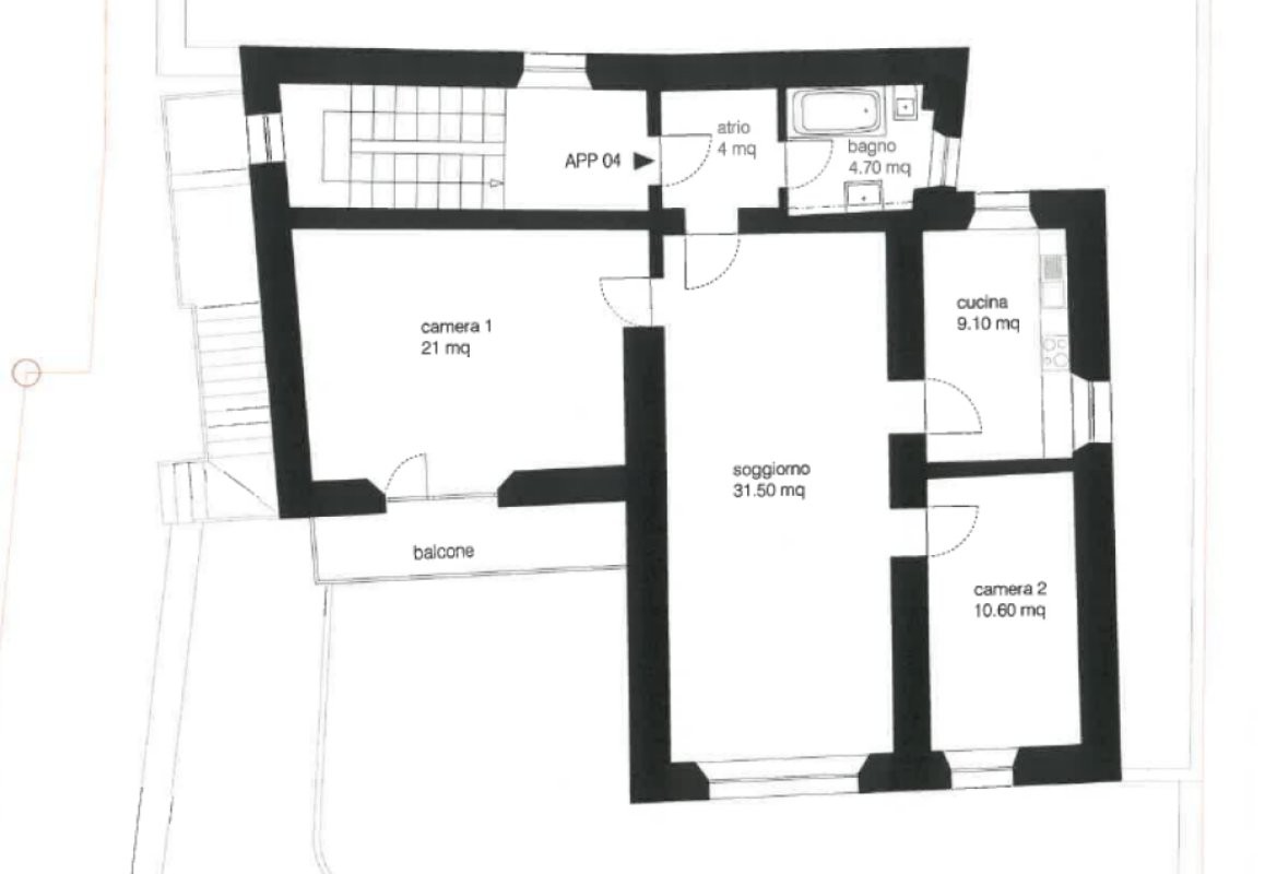 L'appartamento al terzo piano si compone come segue: Atrio, soggiorno di 30 m2, una camera da letto di 10.5m2, una camera da letto di 21m2, una cucina separa di 9m2 e un bagno con finestra di 5m2, balcone. A completare, al piano terra si trova il locale lavanderia e si accede al cortile condominiale. Non vi sono posteggi.