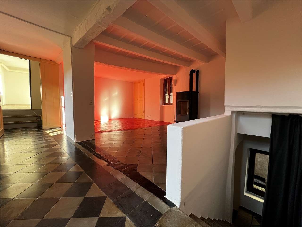Salendo al secondo piano si apre un ampio soggiorno, dotato di stufa a pellet, che crea unatmosfera intima e confortevole. Pochi gradini conducono a una stanzetta versatile, ideale come studio o angolo relax.