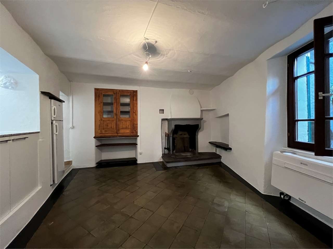 Al primo livello si trovano una cucina con zona pranzo/tinello, arricchita da un camino perfettamente funzionante, e un bagno con doccia.
